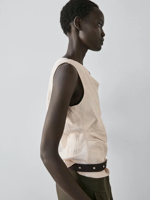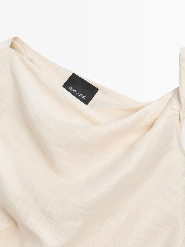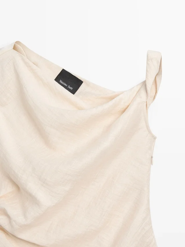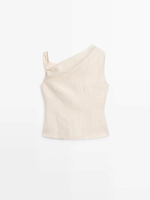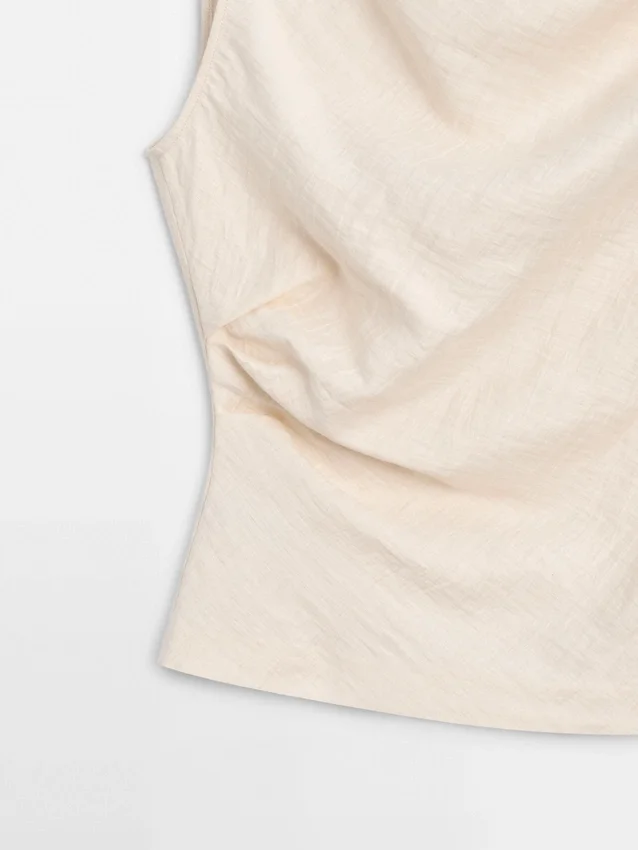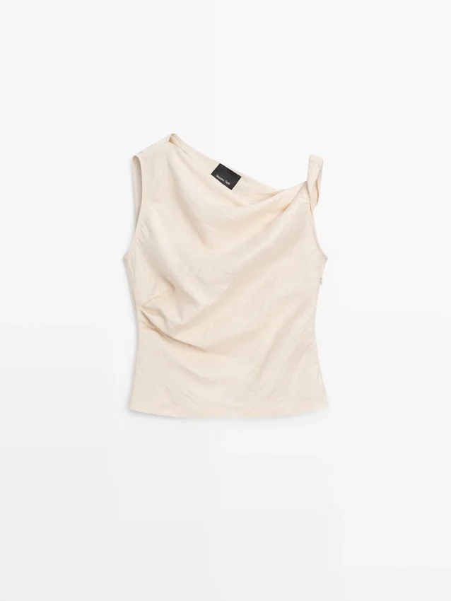 Asymmetrisches Oberteil mit drapierten Details. Ärmellos. Knotendetail. Passendes Kleidungsstück erhältlich.
