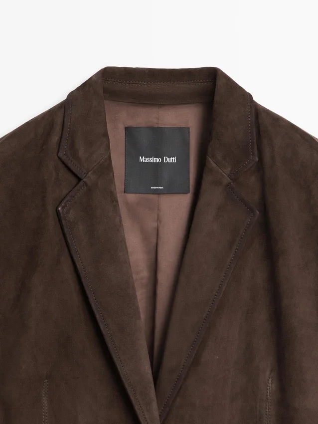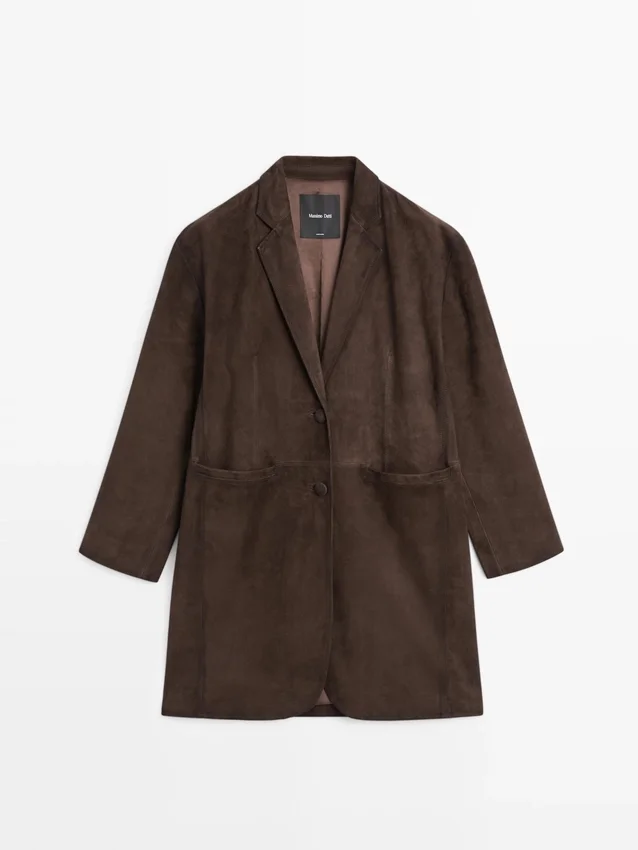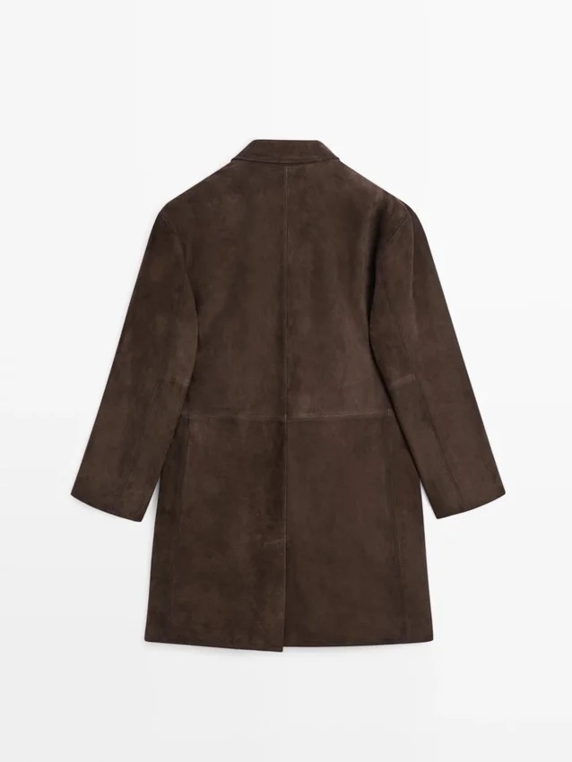 Langer Mantel aus Ziegenleder mit Wildleder-Finish. Reverskragen. Lange Ärmel. Zwei-Knopf-Verschluss. Zwei Vordertaschen. Öffnung mittig am Rücken. Verdeckte Knöpfe.