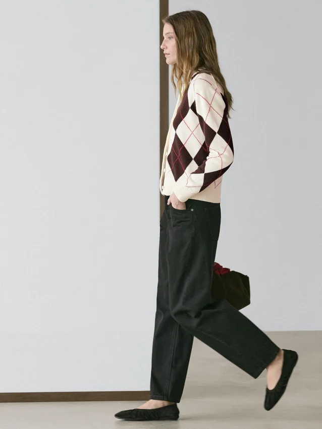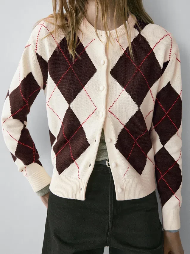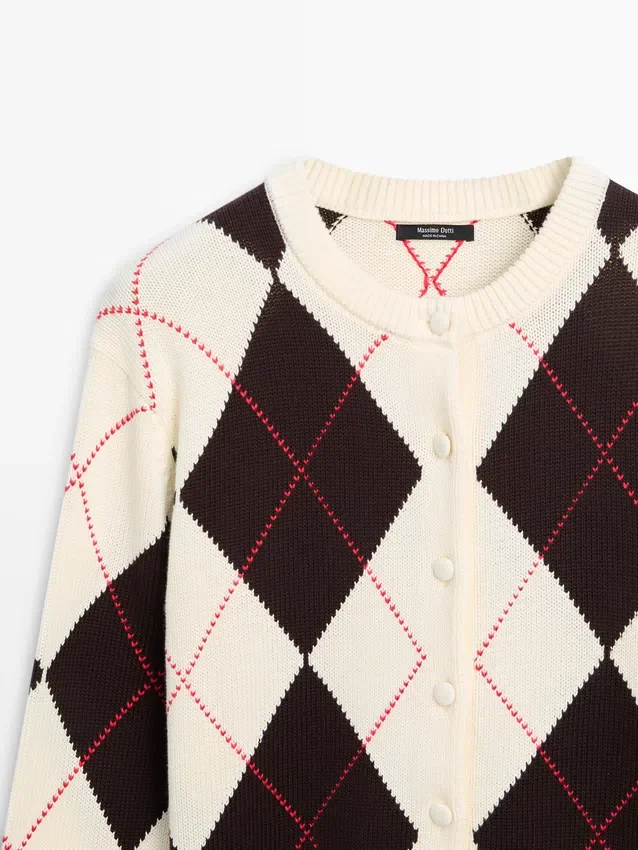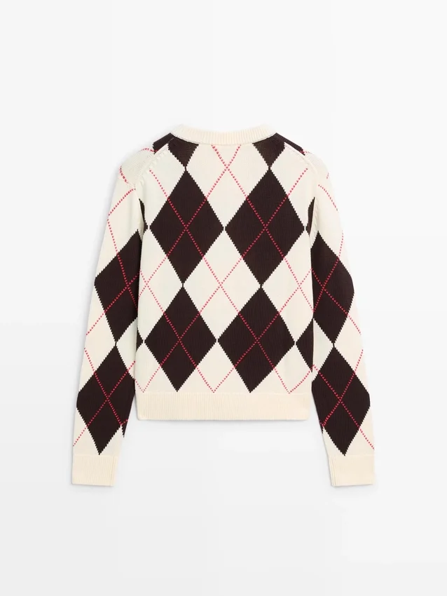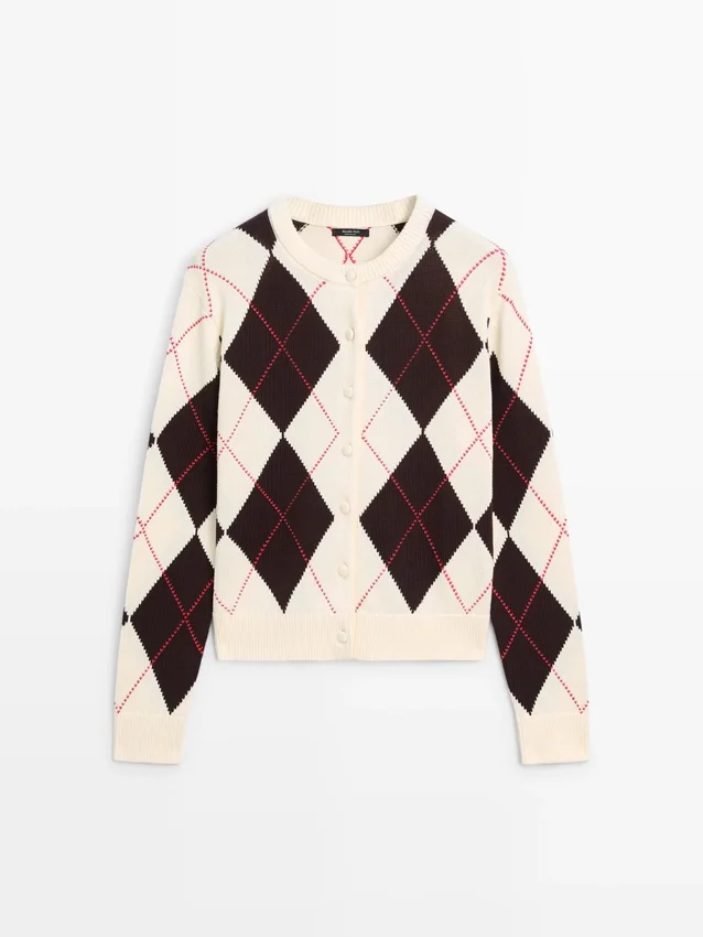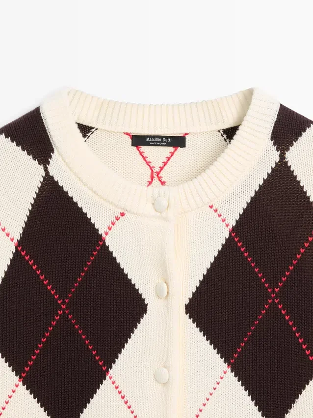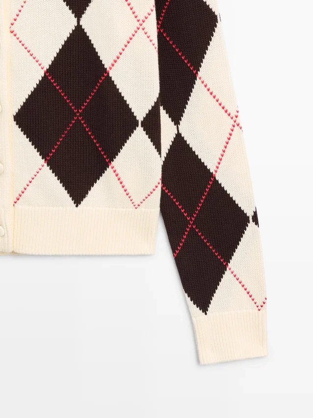 Cardigan aus Baumwollstrick. Rundhalsausschnitt. Lange Ärmel. Knopfleiste vorne. Rautenmuster. Gerippter Kragen, Ärmelbündchen und hinterer Saum .Materialzusammensetzung