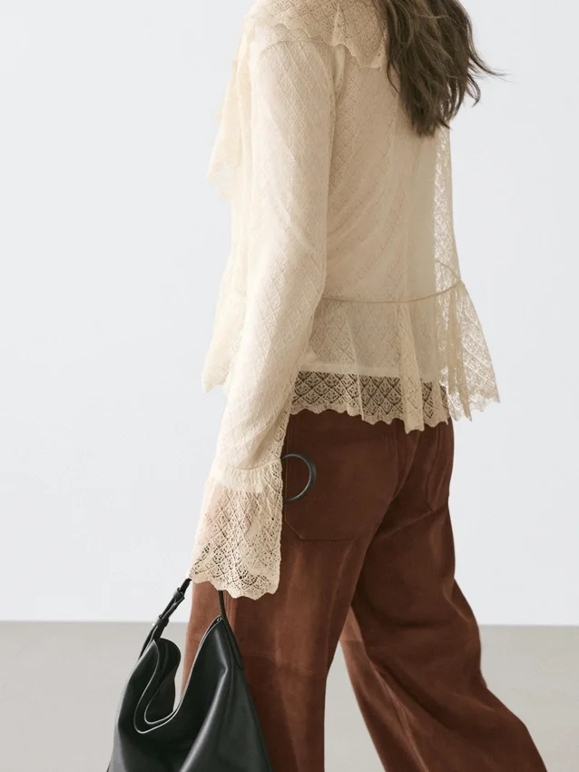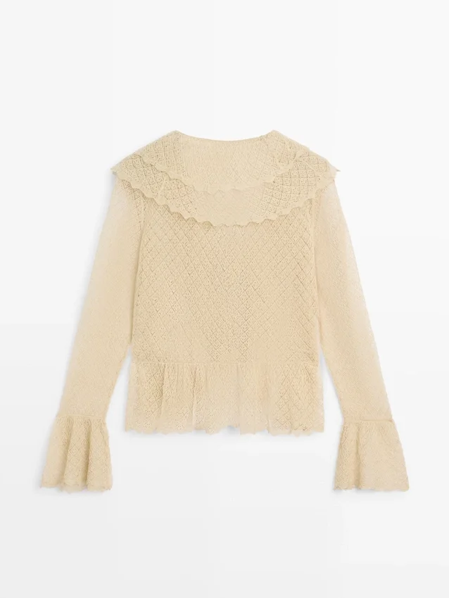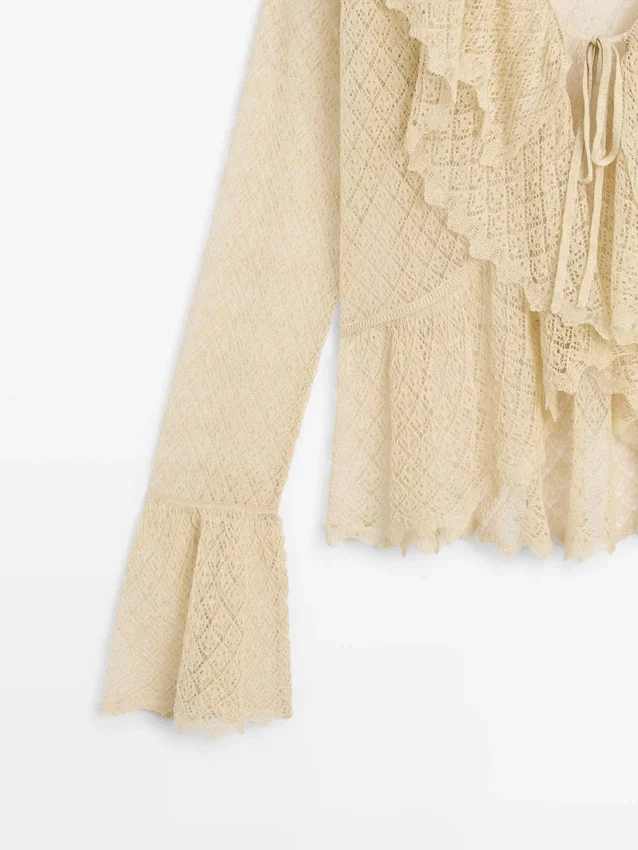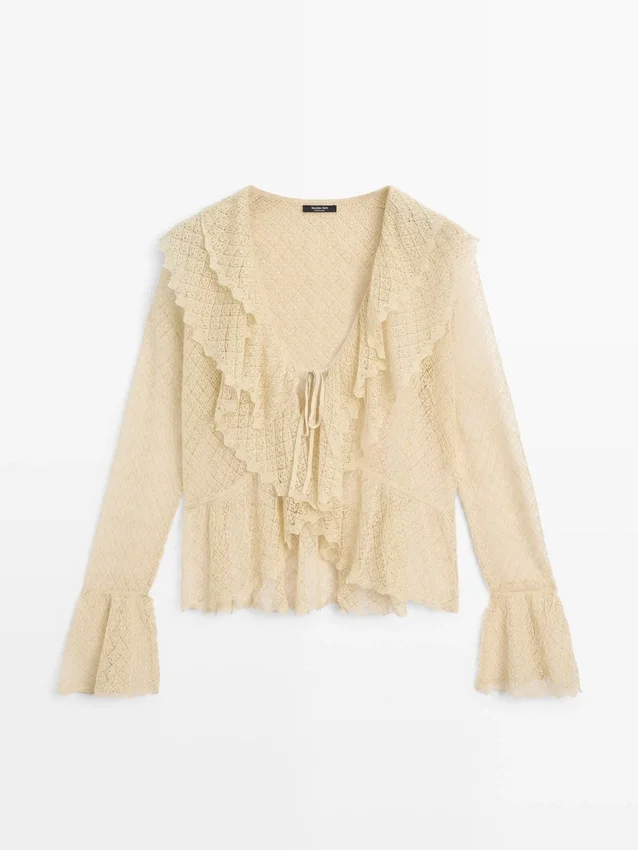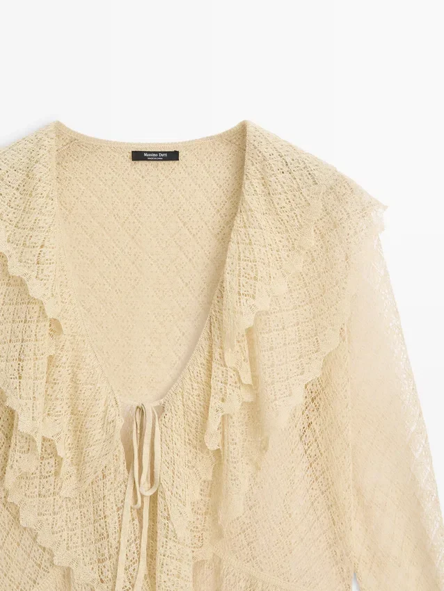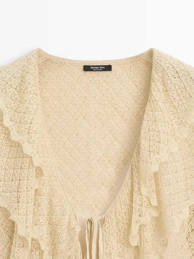 Cardigan aus einem Strickstoff aus Leinenmischung. V-Ausschnitt. Lange Ärmel mit Rüschen. Schleifenverschluss. Rüschen-Detail.
