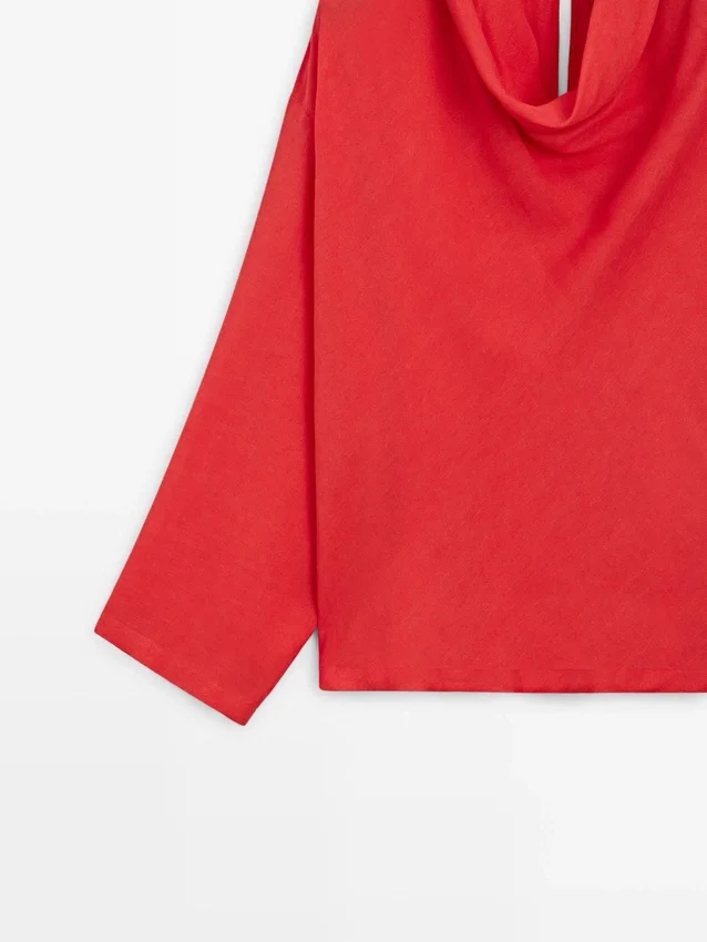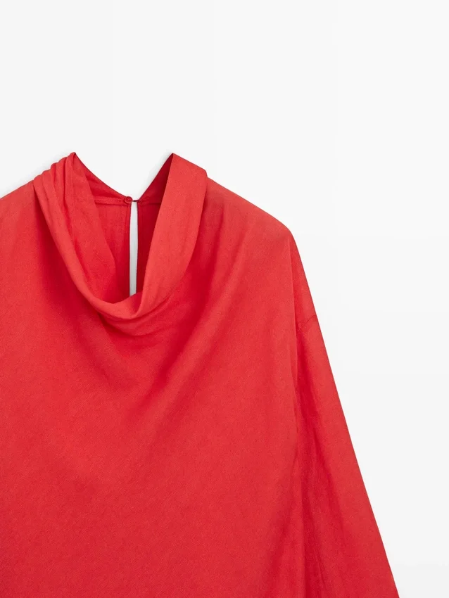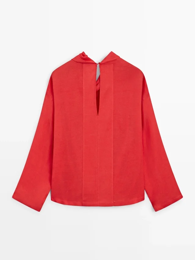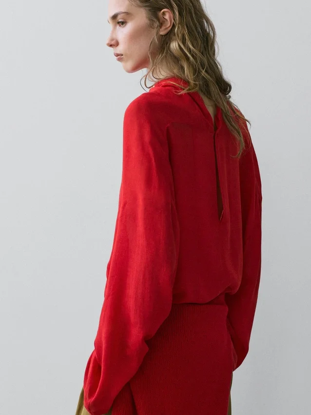 Fließende Bluse. Drapierter Kragen. Lange Ärmel. Knopfleiste am Rücken und tropfenförmiger Ausschnitt.