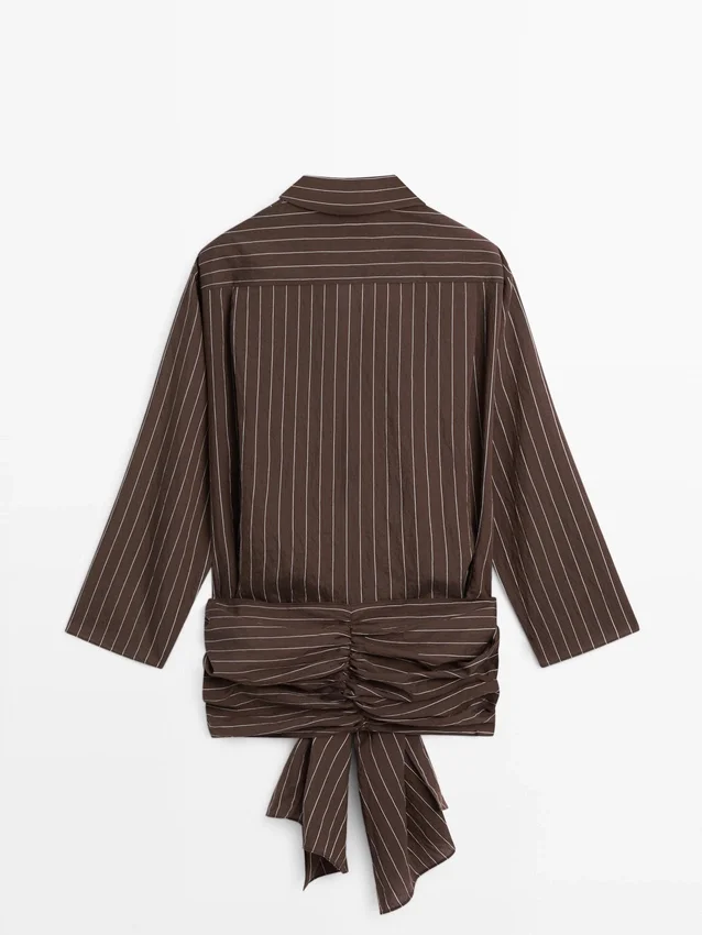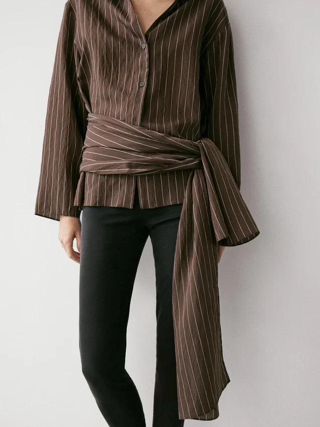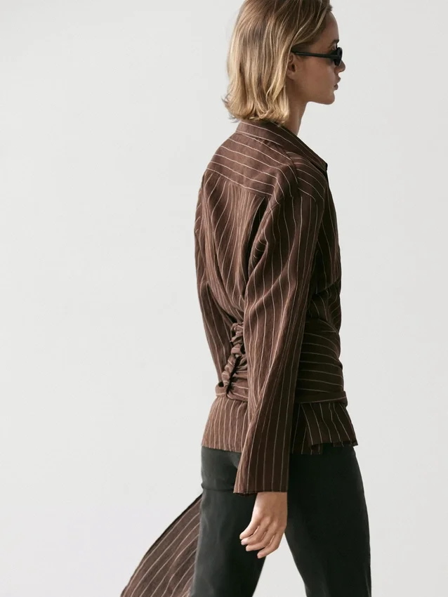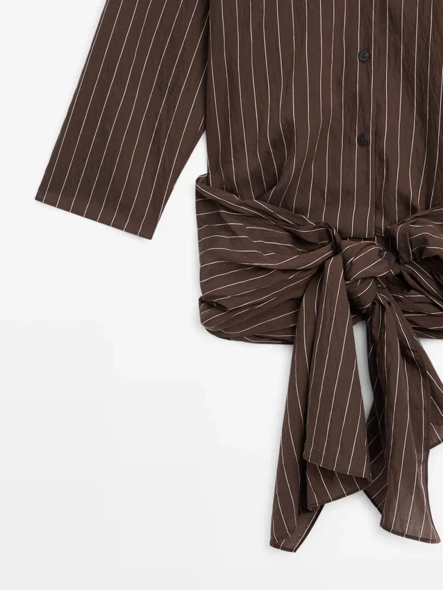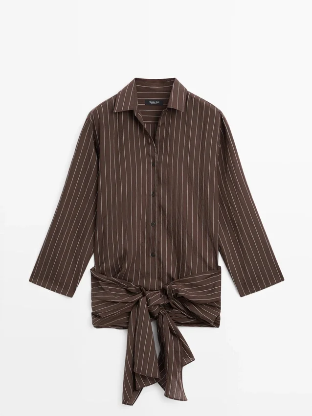 Fließendes Hemd. Hemdkragen. Lange Ärmel. Knopfleiste vorne. Seitliche Bindebänder.