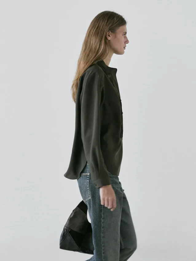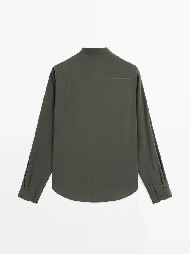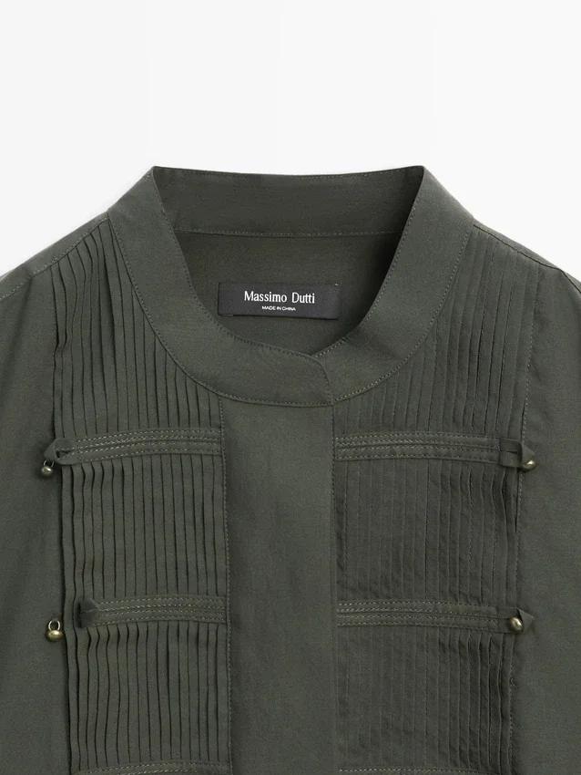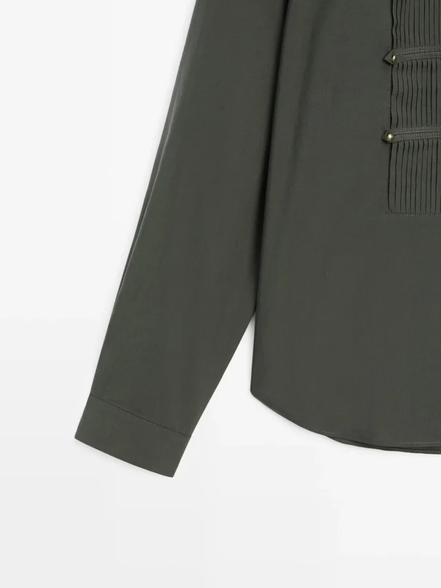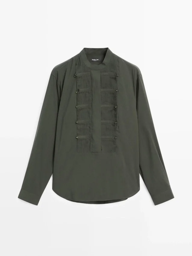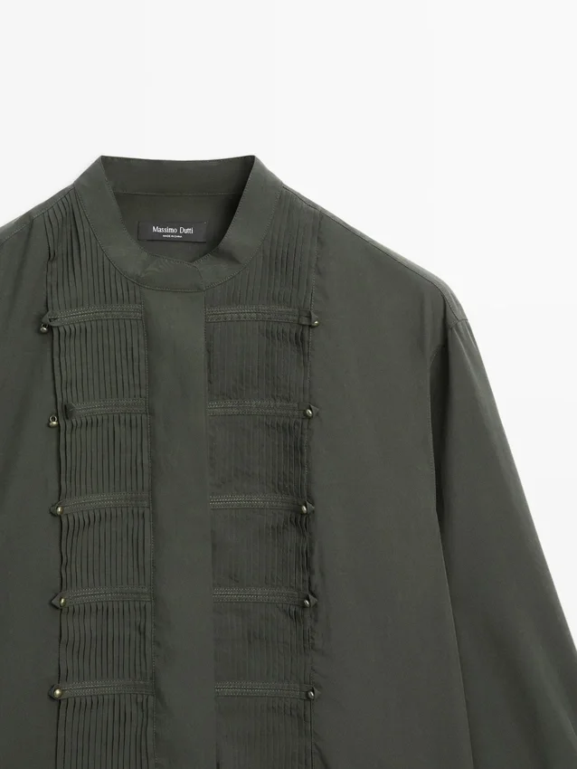 Langarmhemd. Stehkragen. Knopfleiste auf der Vorderseite, verdeckt durch eine Knopfleiste. Biesen. Detail an der Brust.