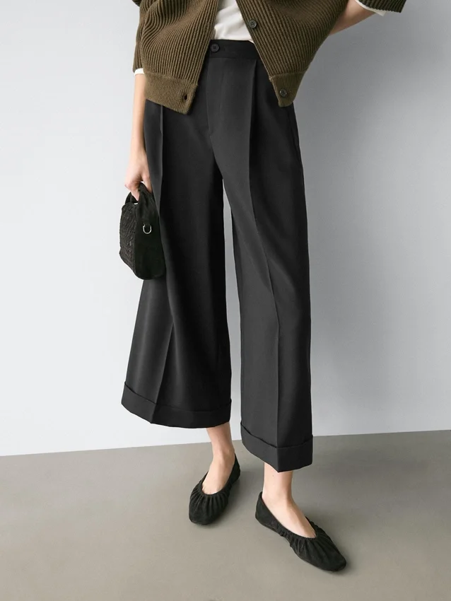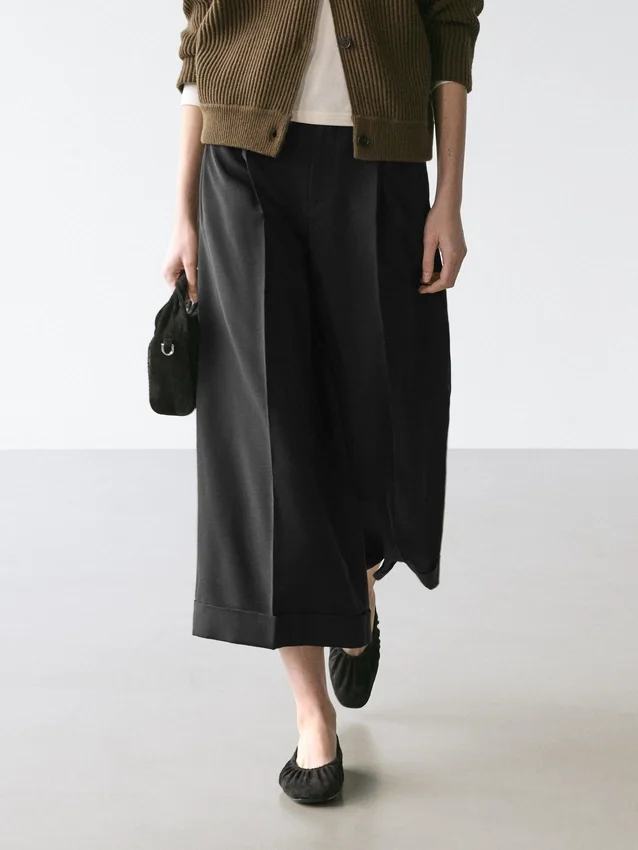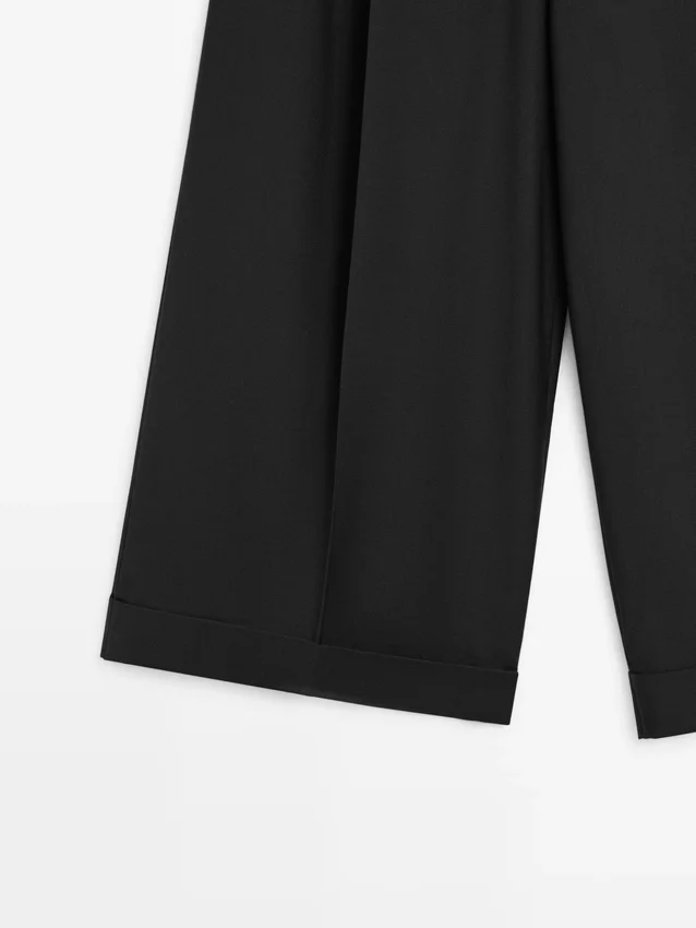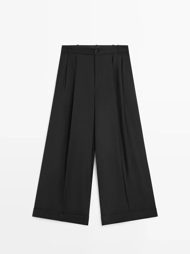 Hosen aus fließendem Stoff. Bund mit Gürtelschlaufen. Verdeckter Reißverschluss mit geknöpfter Blende. Zwei Seitentaschen.