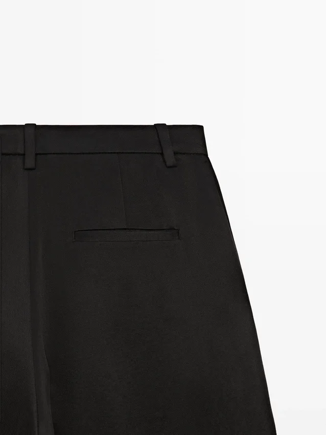 Hosen aus fließendem Stoff. Bund mit Gürtelschlaufen. Reißverschluss durch eine Blende verdeckt, innen Knopf. Zwei Seitentaschen. Eine Paspeltasche hinten. Plissee-Details vorne.
