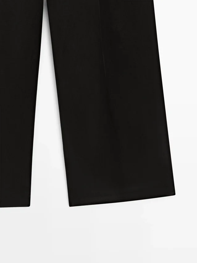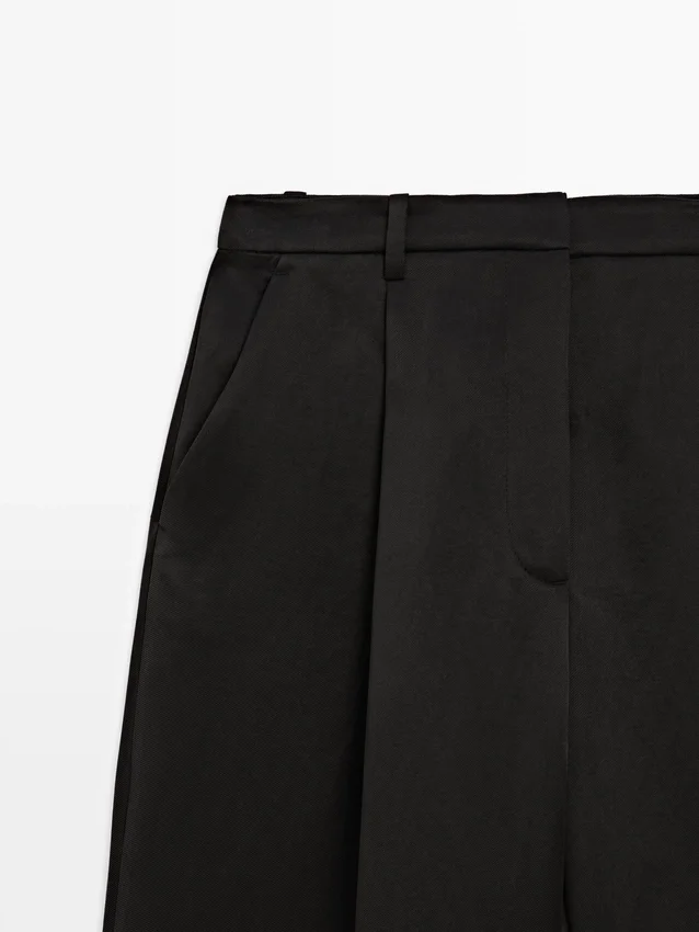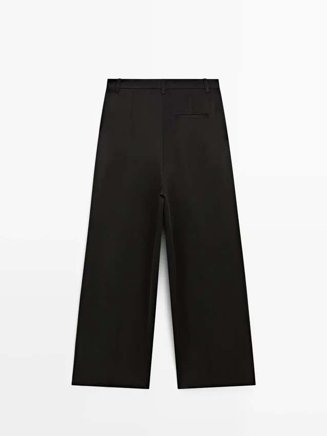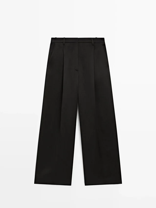 Hosen aus fließendem Stoff. Bund mit Gürtelschlaufen. Reißverschluss, verdeckt durch eine Blende, innen mit Knopf. Zwei Seitentaschen. Eine Paspeltasche hinten. Plissee-Details vorne.