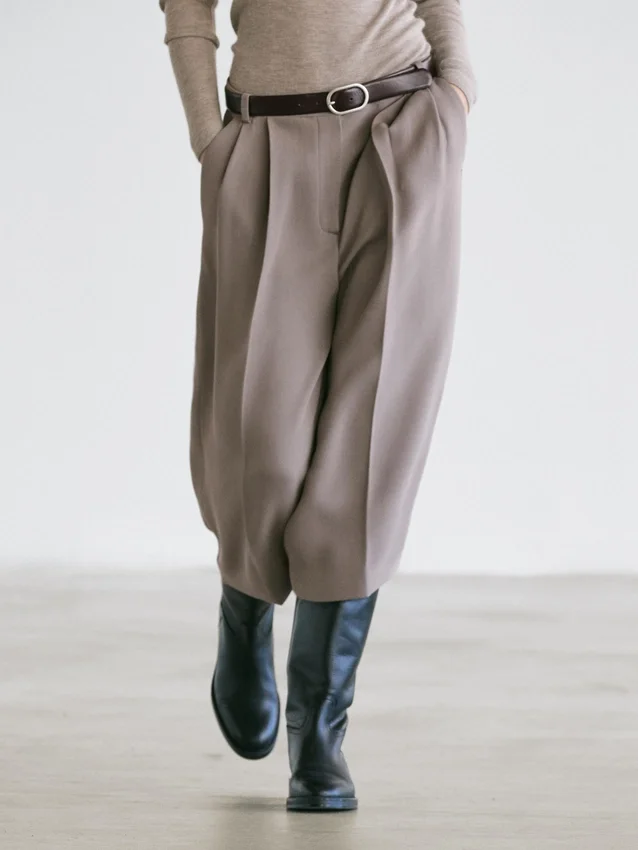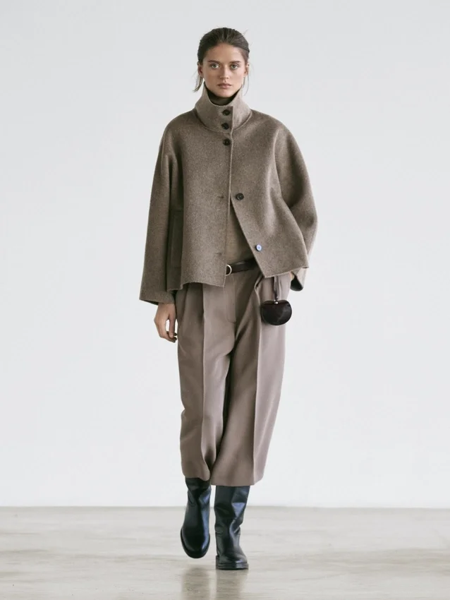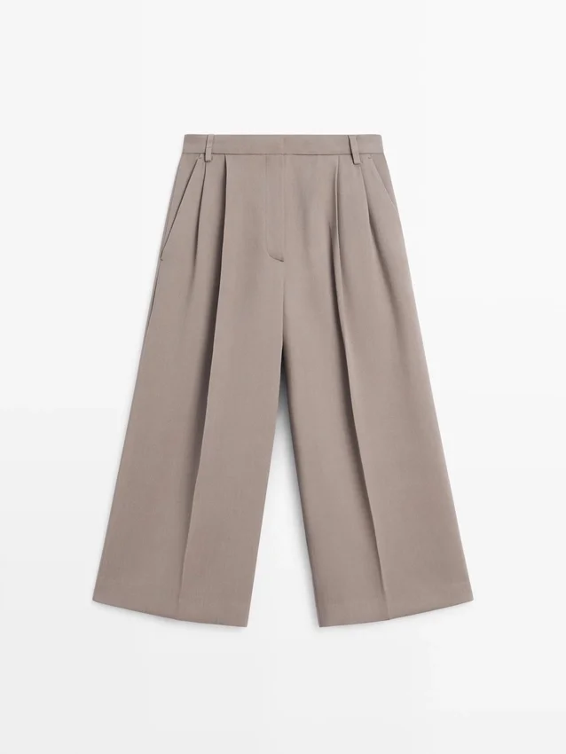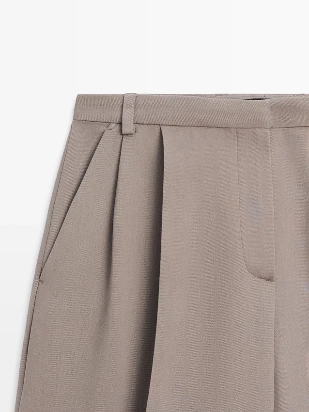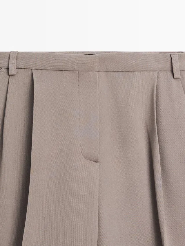 Lange Bermudashorts aus fließendem Stoff. Bund mit Gürtelschlaufen. Reißverschluss, verdeckt durch eine Blende, mit Haken- und Ösenverschluss und Knopf. Zwei Seitentaschen. Eine Paspeltasche hinten. Abnäherdetail vorne.