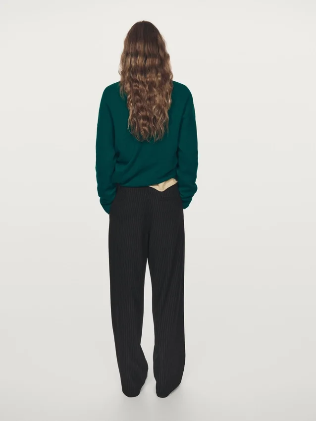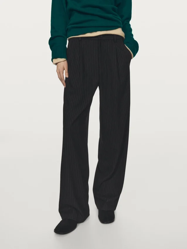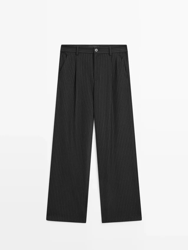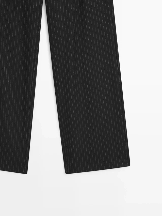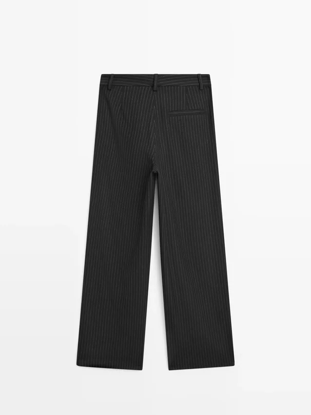 Hose. Reißverschluss vorne und Knopfverschluss oben. Zwei Seitentaschen. Eine Paspeltasche hinten. Nadelstreifen.