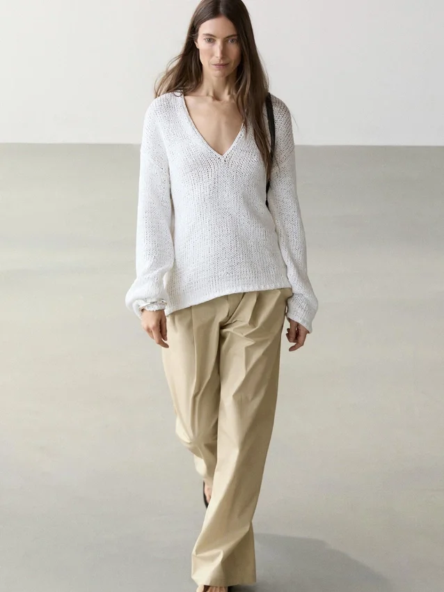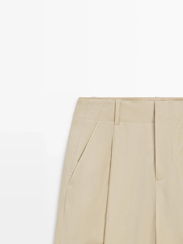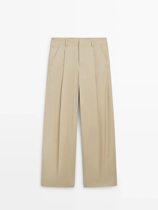 Hose mit weitem Bein: Dieser Schnitt zeichnet sich durch eine weite und lockere Passform von der Hüfte bis zum Knöchel aus und bietet hohen Tragekomfort. Hose mit Abnähern. Bund mit Gürtelschlaufen. Zwei Seitentaschen. Abnäherdetail auf der Vorderseite. Reißverschluss und verdeckter Knopfverschluss.