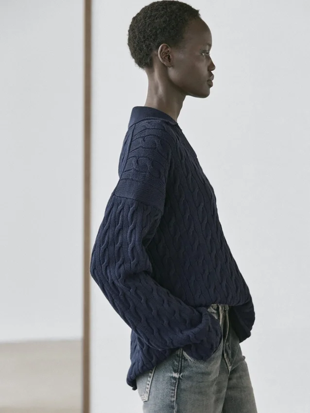 Johnny-Kragen. Lange Ärmel. Geflochtene Details.