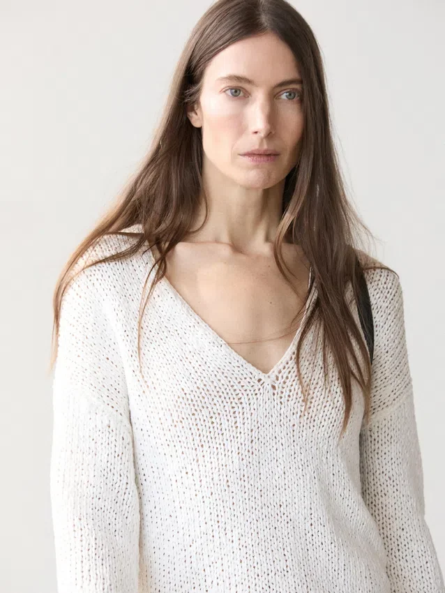 Strickpullover aus einem Baumwollmischgewebe. V-Ausschnitt. Lange Ärmel. Durchbrochenes Gewebe.