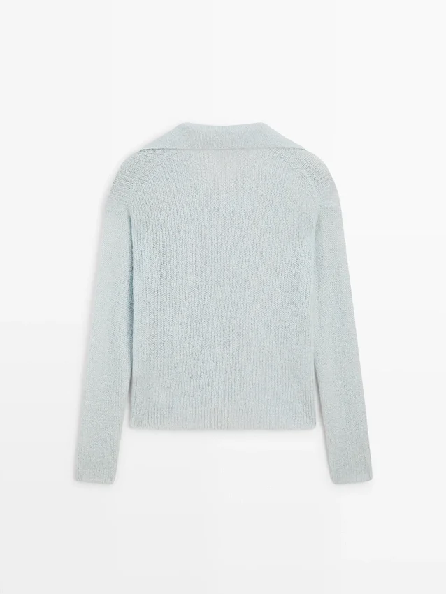 Strickpullover aus einer Alpaka-Mischung. Johnny-Kragen. Lange Ärmel. Detail mit überschnittenen Schultern.