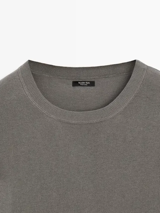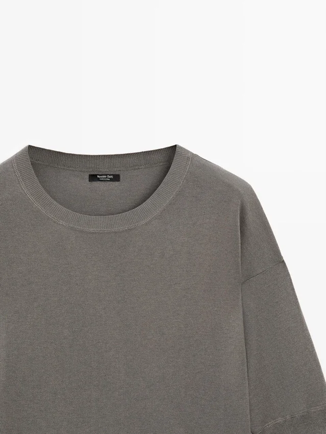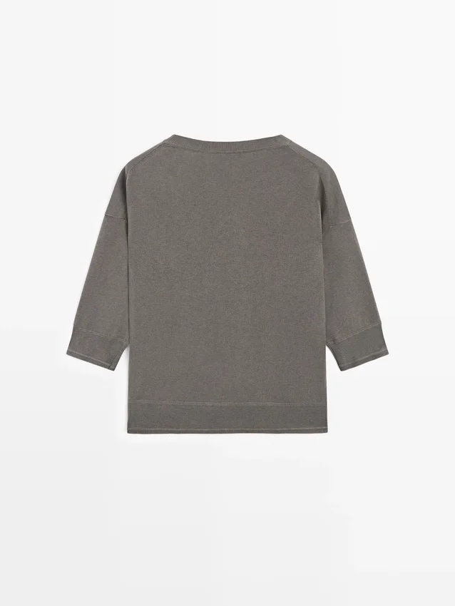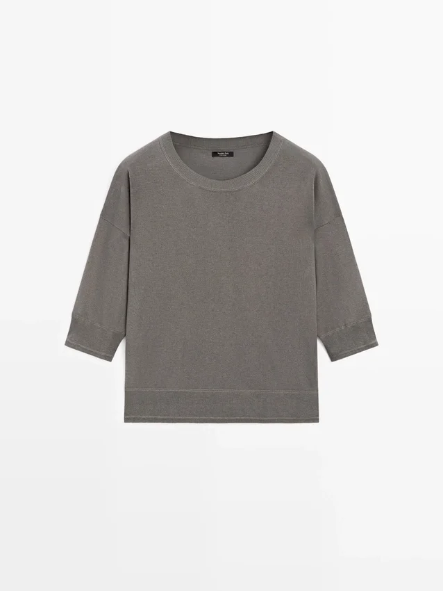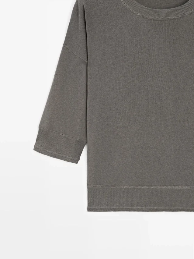 Rundhalsausschnitt. Ellbogenlange Ärmel. Gerippte Bündchen.