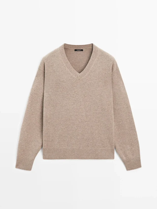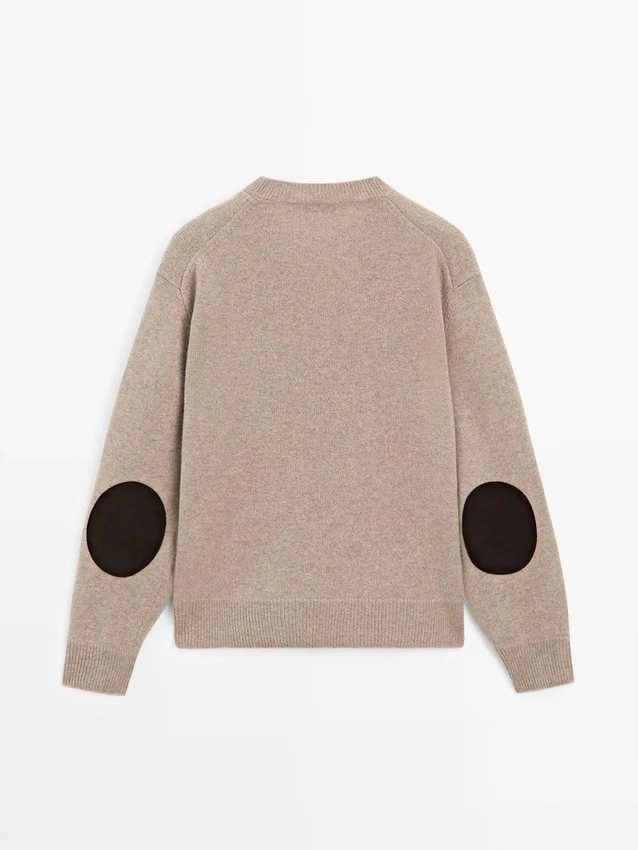 Strickpullover aus einem Wollmischgewebe. V-Ausschnitt. Lange Ärmel. Kontrastierende Ellbogenpatches. Gerippte Bündchen.