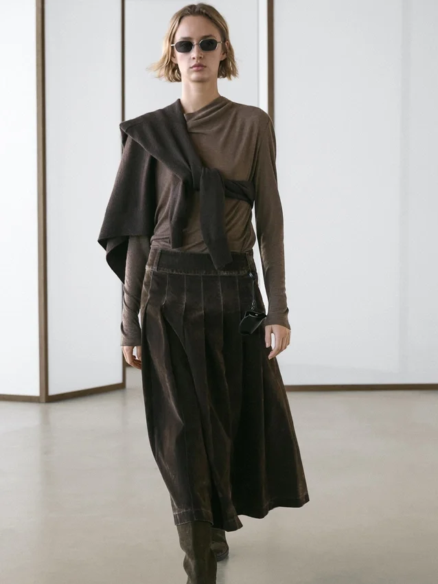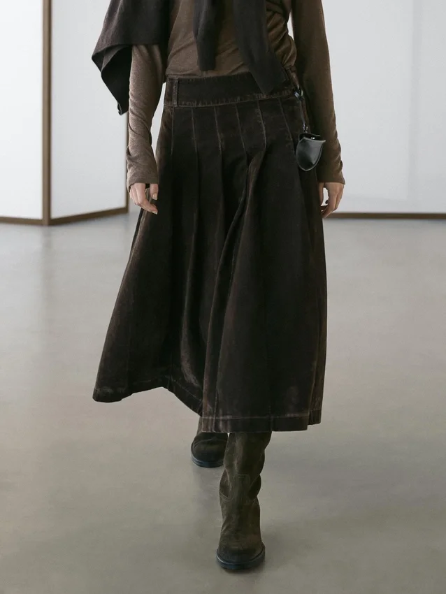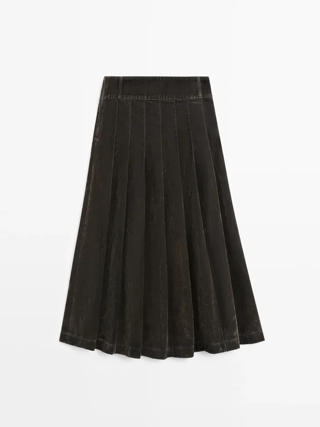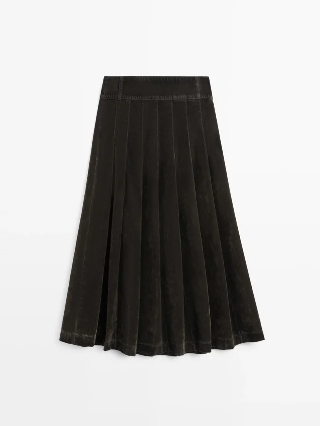 Midirock mit Kellerfalten. Reißverschluss. Denim-Optik. Beflocktes Finish, samtiger Effekt, weich im Griff.