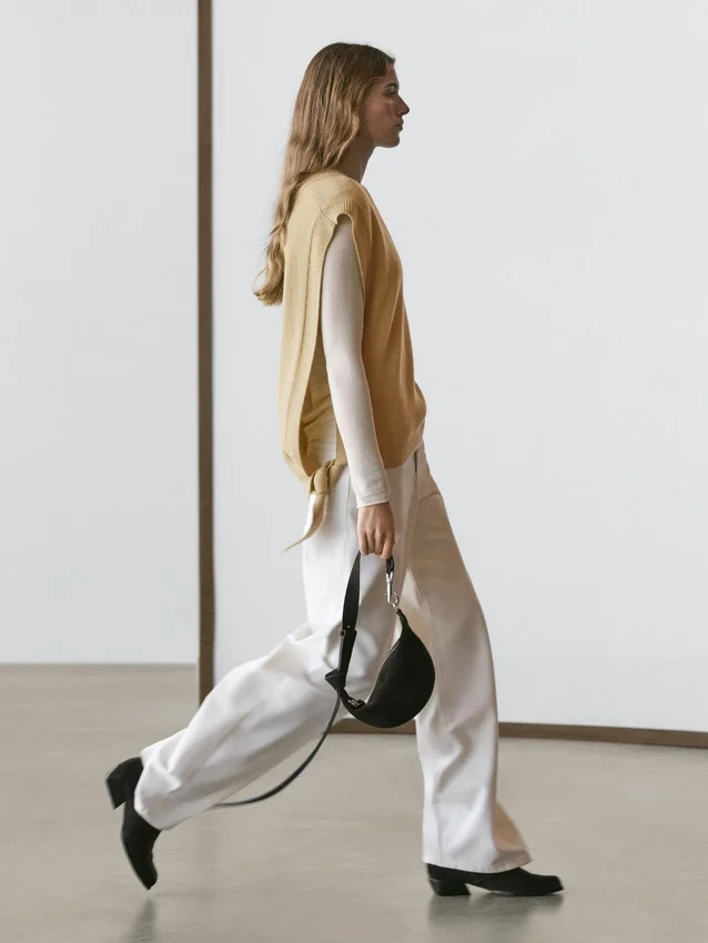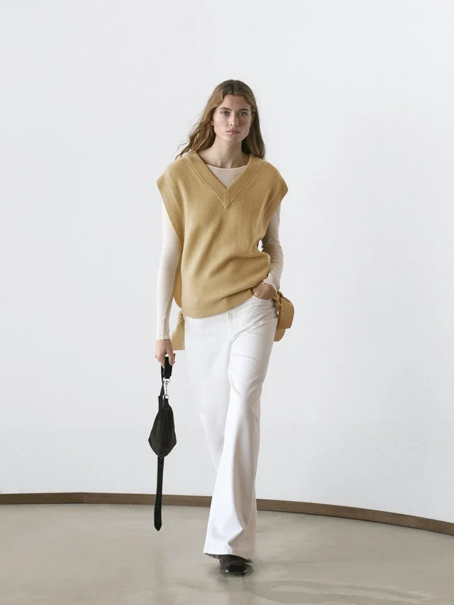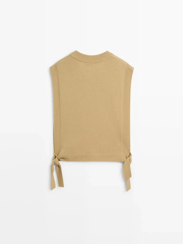 Dünner, langer Pullover aus Baumwollmischgewebe. V-Ausschnitt. Schlaufen an der Taille. Gerippte Bündchen.