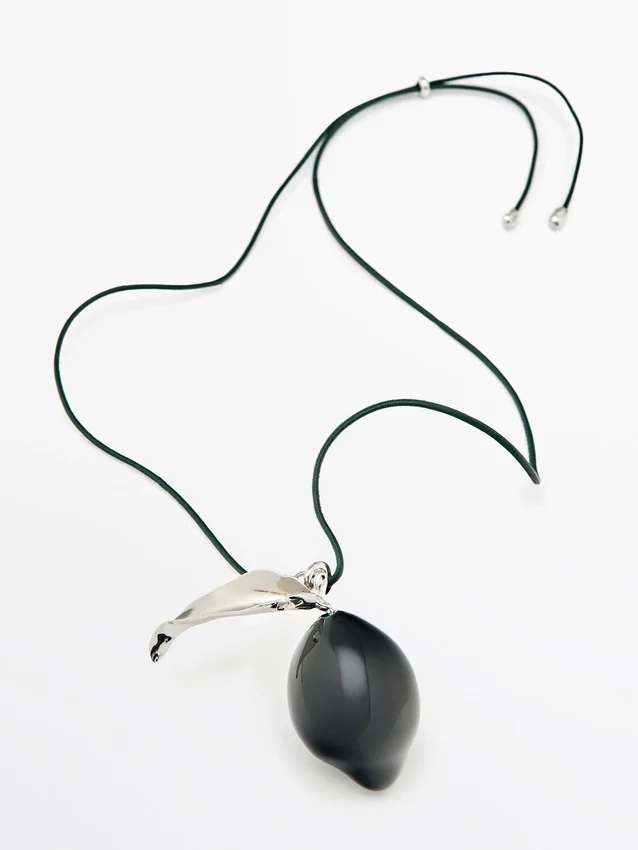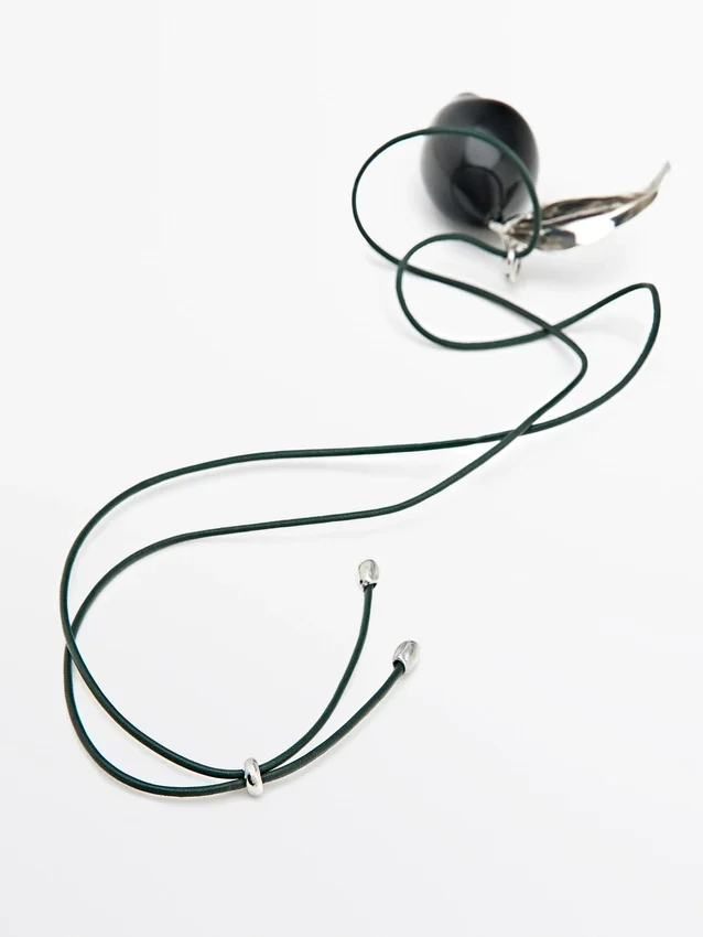 Halskette aus Lederband mit Glasanhänger und Blattdetail. Kordelzugverschluss.