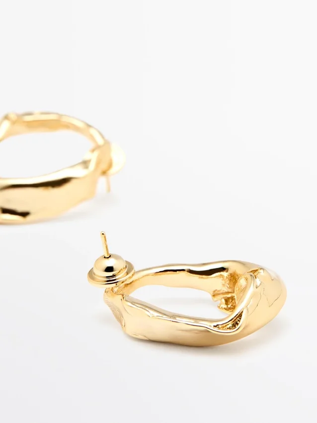 Unregelmäßig geformte Metallohrringe. Druckknopfverschluss. Länge: 4 cm.