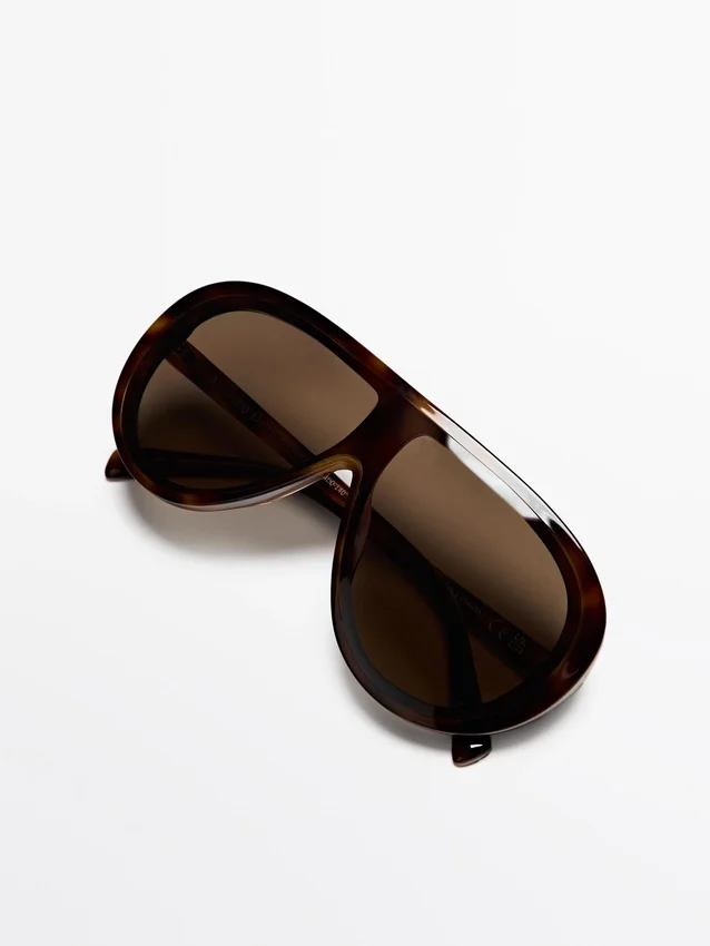 Sonnenbrillen aus Kunststoff. Gläser mit UV-Schutzfilter der Kategorie 3. Inklusive Schutzetui aus geprägtem Leder.Zusammensetzung