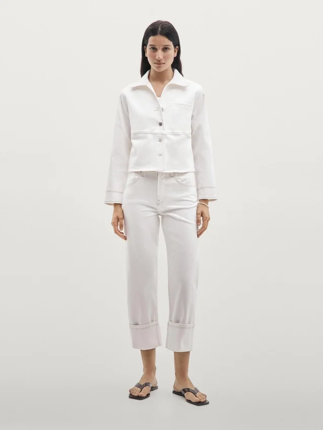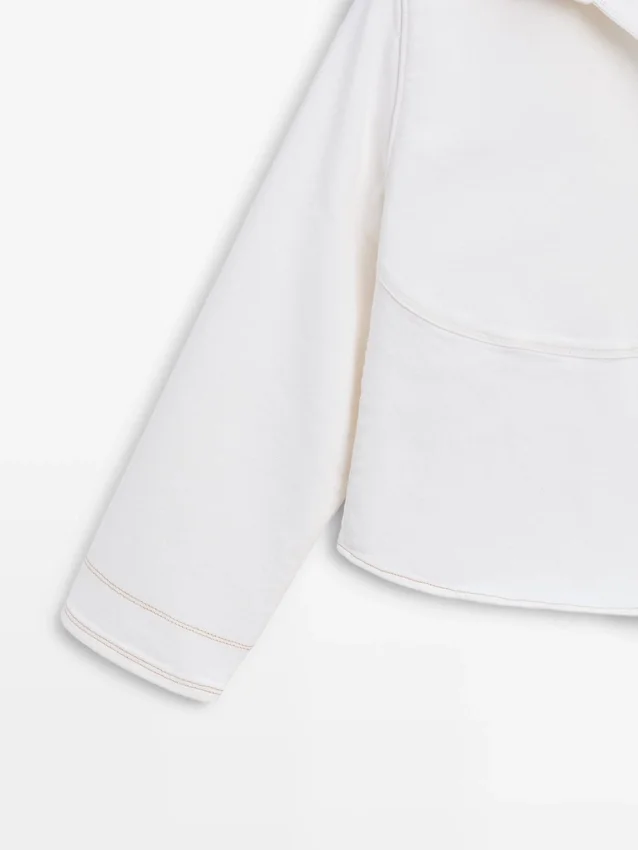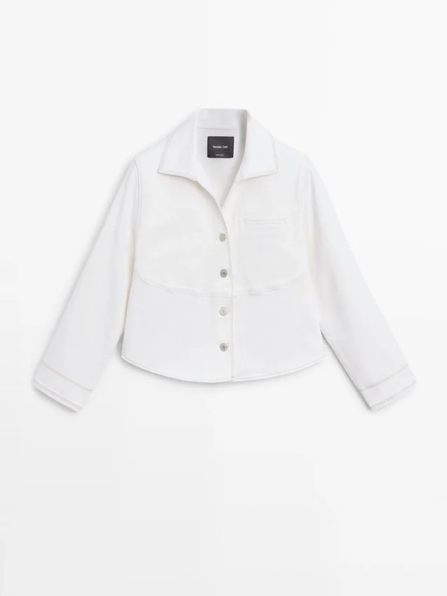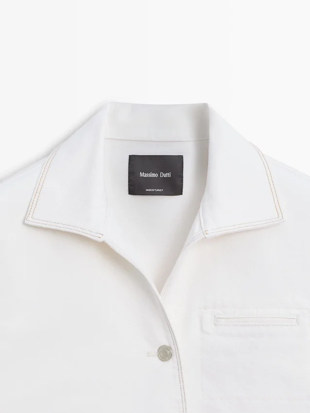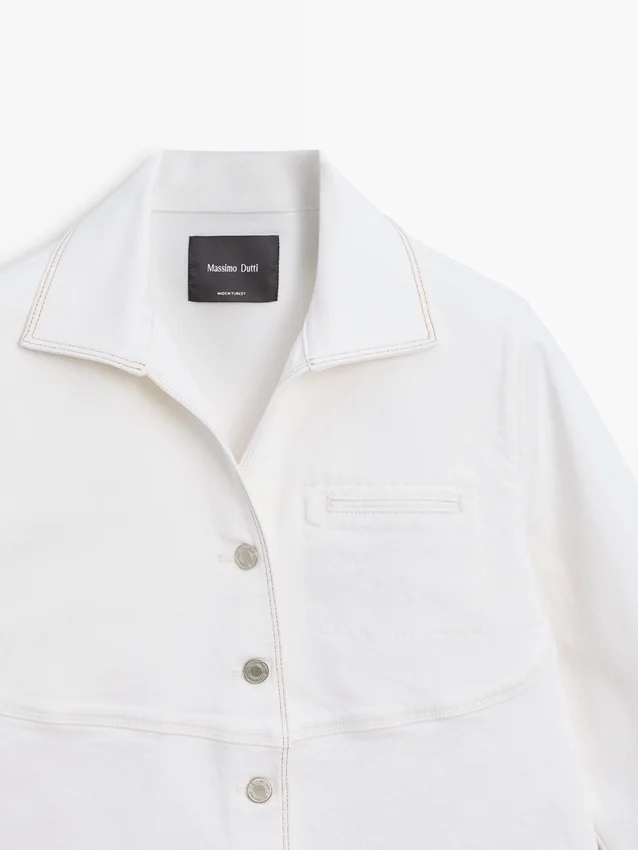 Jeansjacke. Hemdkragen. Lange Ärmel. Knopfleiste vorne. Eingesetzte Leistentasche auf der Brust. Kontrastfarbene Details.