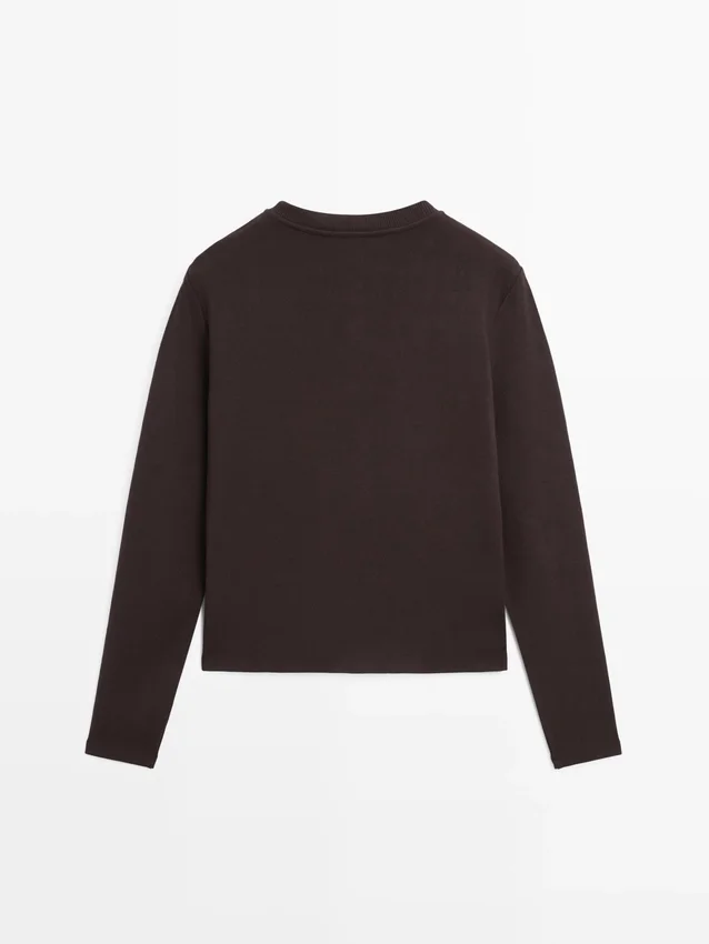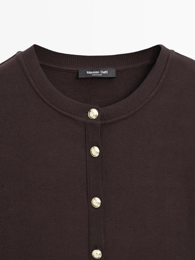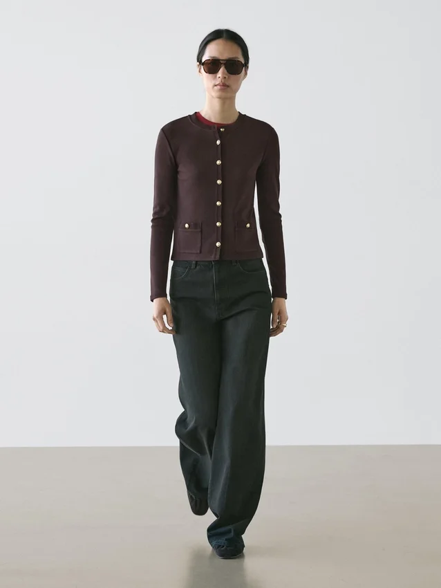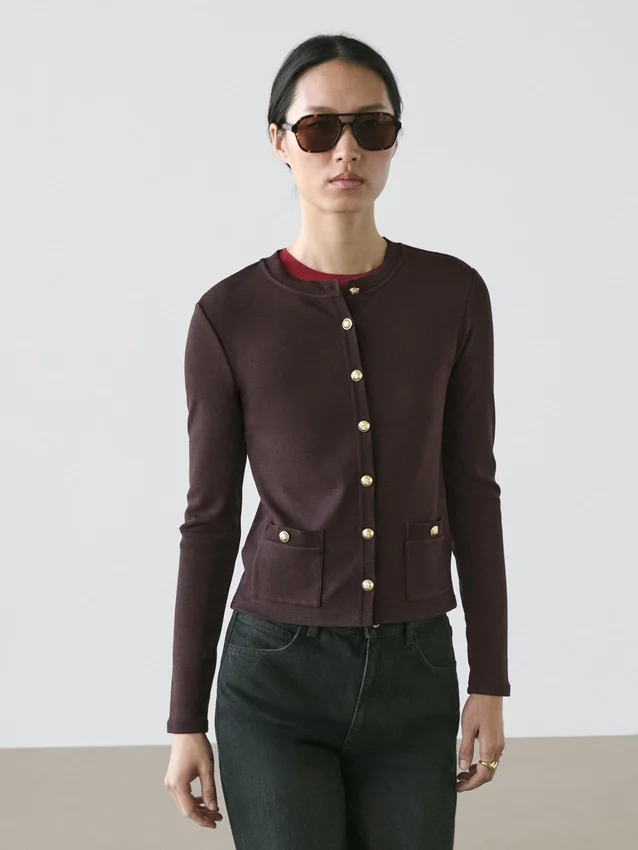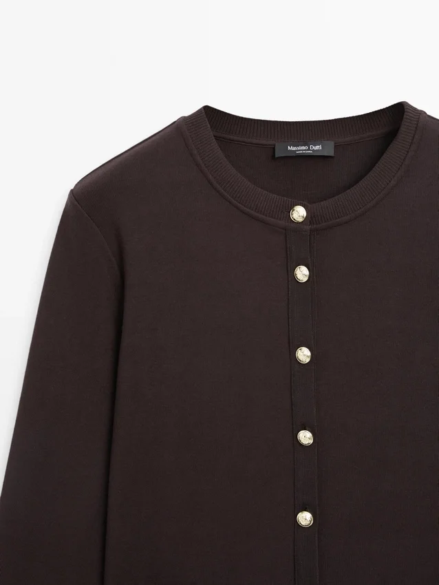 Cardigan. Rundhalsausschnitt. Lange Ärmel. Elegante goldfarbene Strassknöpfe. Zwei Pattentaschen mit Knöpfen.