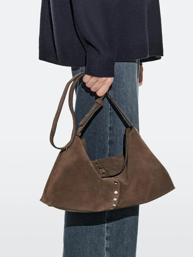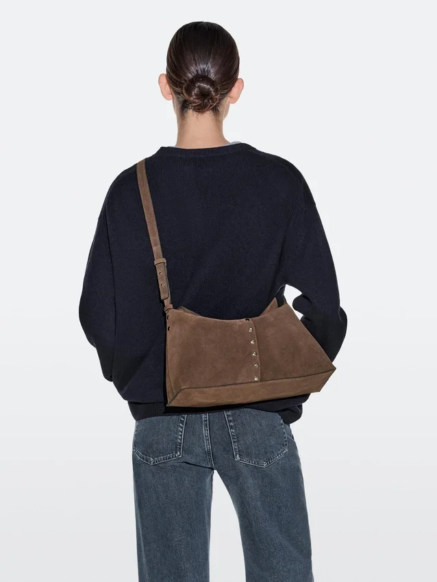 Handtasche aus Rindsleder mit Spaltleder-Finish. Verstellbarer Schulterriemen. Magnet-Druckknopfverschluss. Eine Innentasche. Baumwollfutter. Metallnieten-Detail.