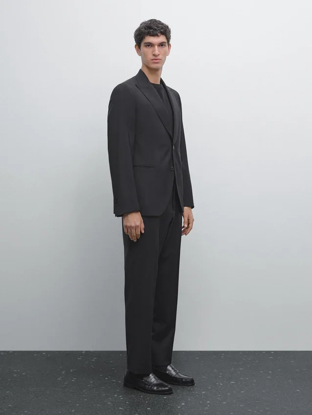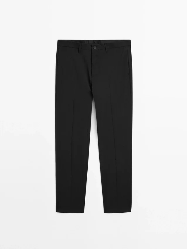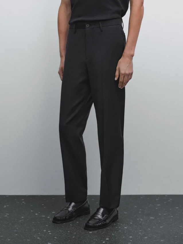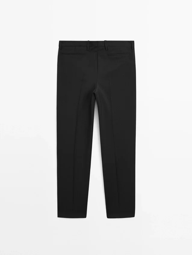 Anzugshose aus 100 % Wolle als Hauptmaterial. Verdeckter Reißverschluss mit Patte, Knopf und Innenknopf. Zwei Seitentaschen. Zwei Paspeltaschen auf der Rückseite. Ziernähte.