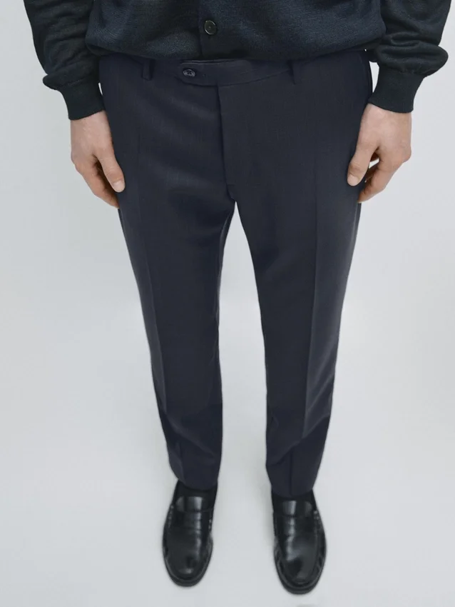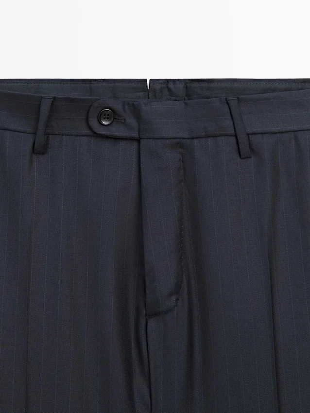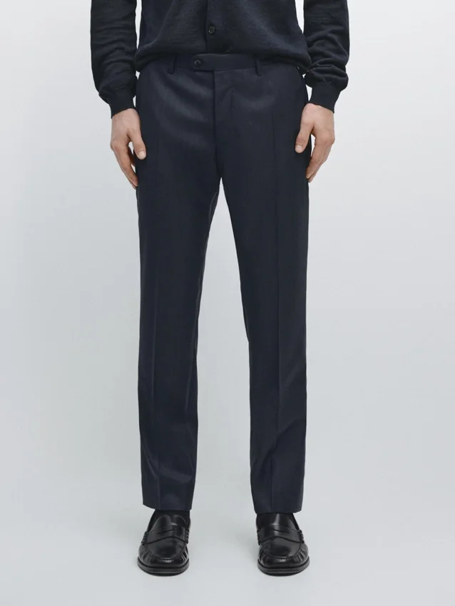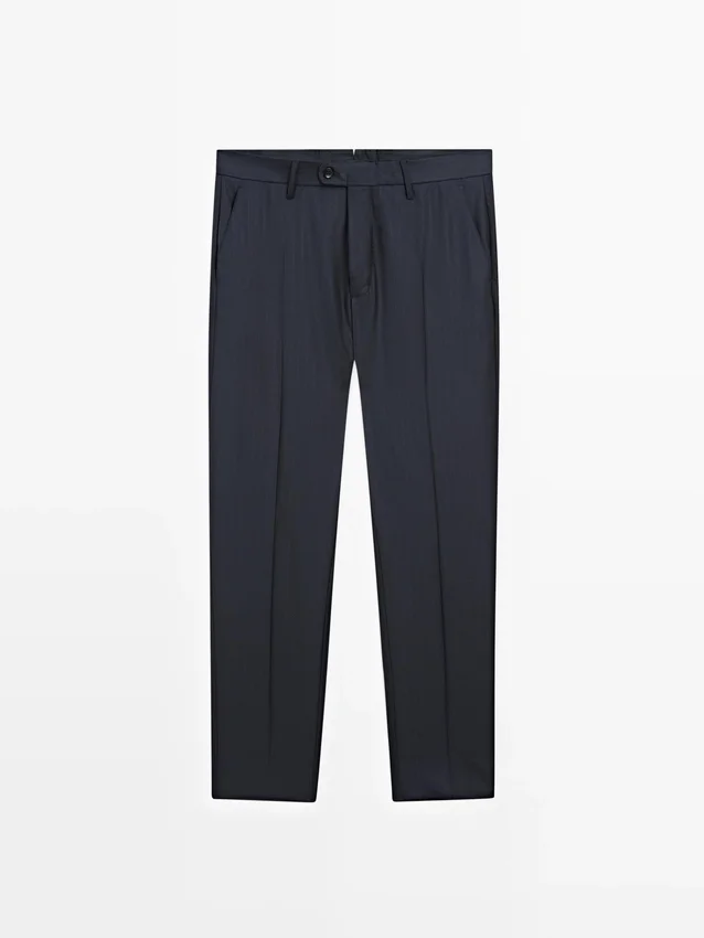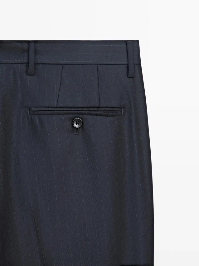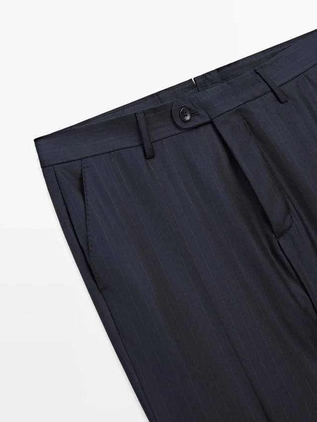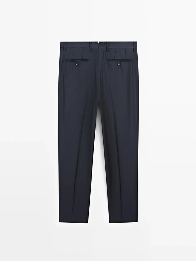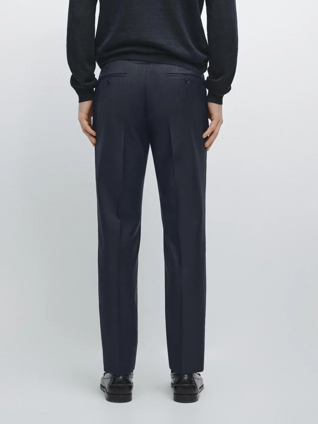 Anzughose aus 100 % Wolle als Hauptmaterial. Reißverschluss, verdeckt durch eine Knopfleiste, Knopf und geknöpften Riemen. Zwei Seitentaschen. Zwei geknöpfte Paspeltaschen auf der Rückseite. Gestreifte Details. Cool Wool: Leichtes, atmungsaktives und knitterfreies Material. Dieses Kleidungsstück ist Teil eines Anzugs.Zusammensetzung