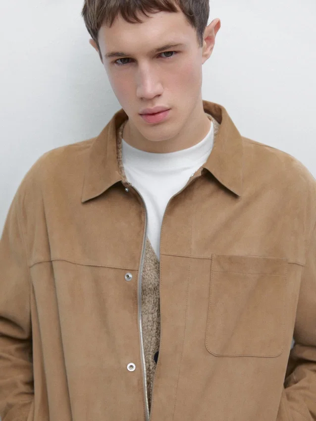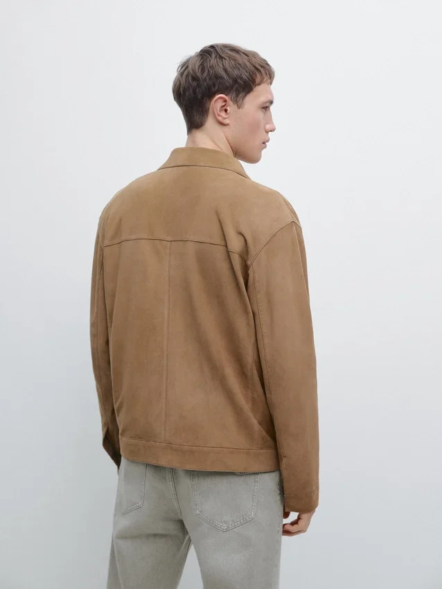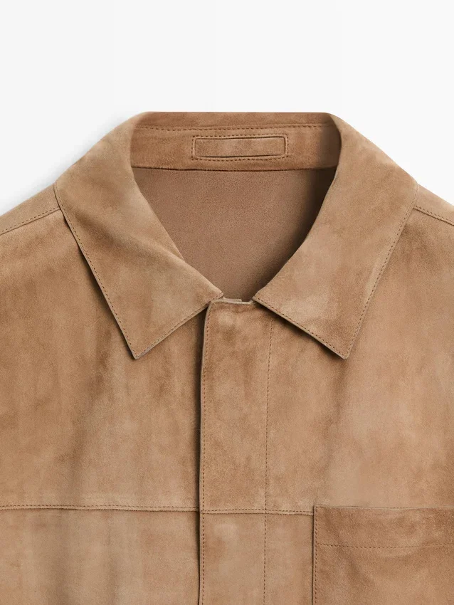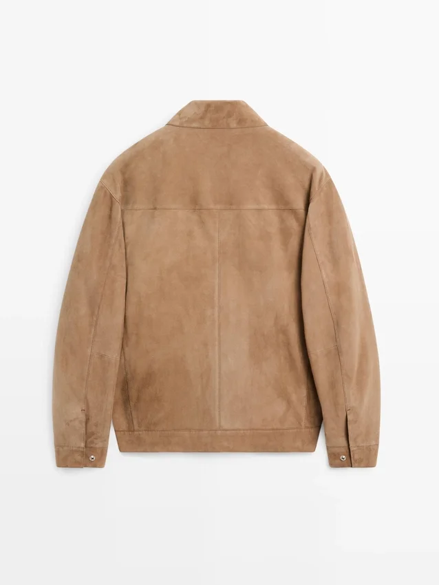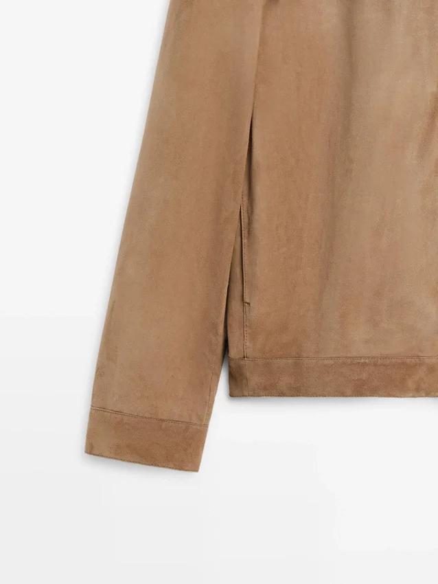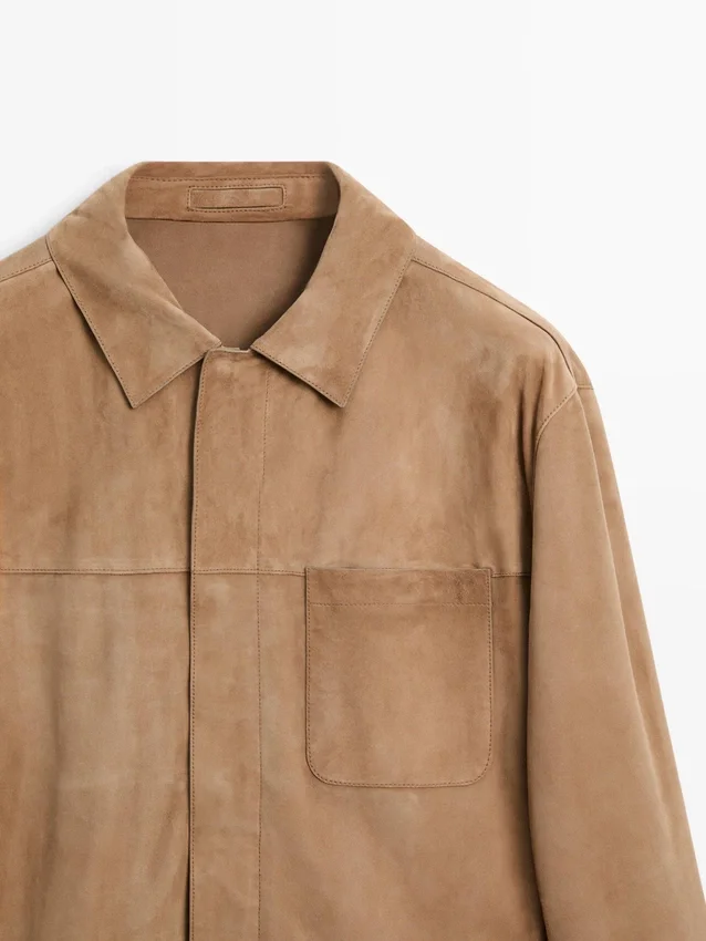 Jacke aus Ziegenleder mit Wildleder-Finish. Hemdkragen. Verdeckter Reißverschluss mit geknöpfter Blende. aufgesetzte Brusttasche. Gefüttert.