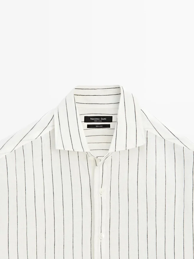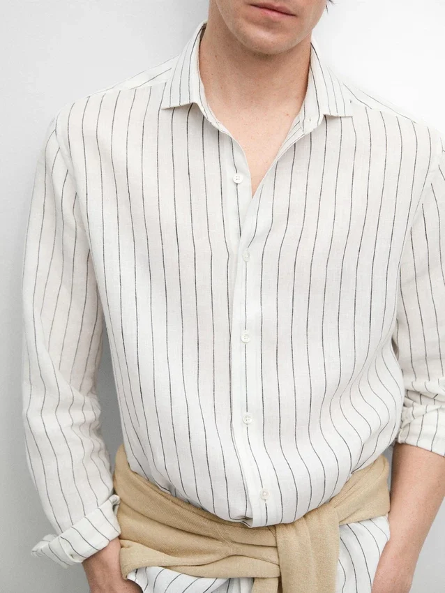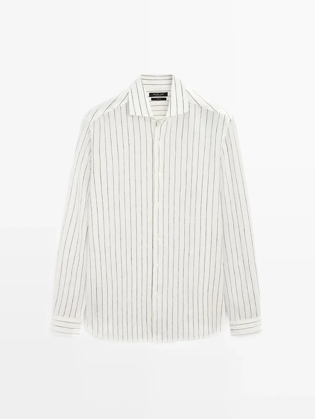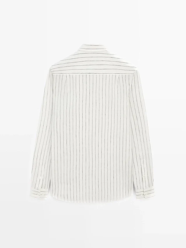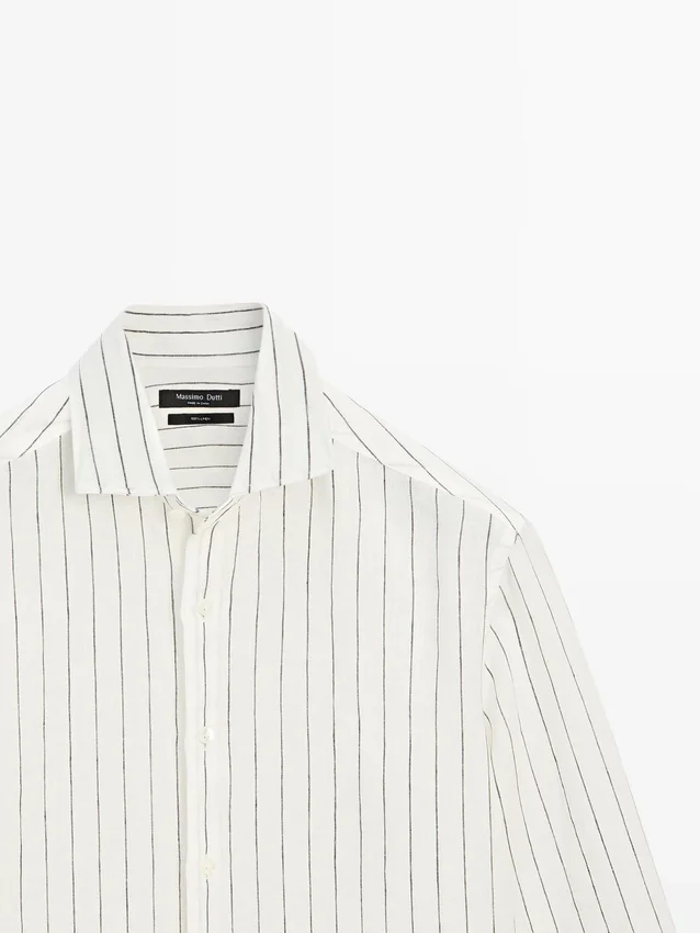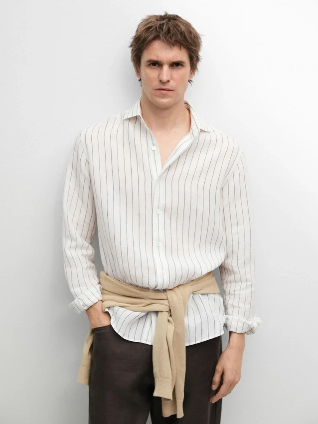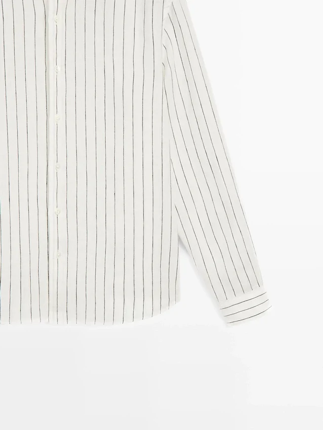 Lange Ärmel mit geknöpften Manschetten. Hemdkragen. Knopfleiste vorne. Gestreiftes Muster. Aus 100 % Leinen. Extra dünner Stoff.
