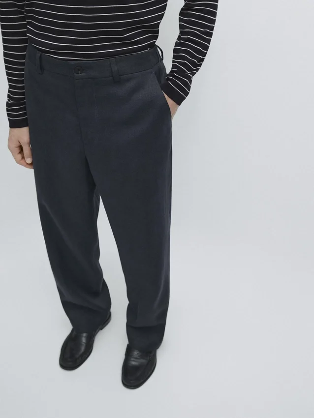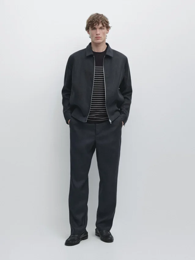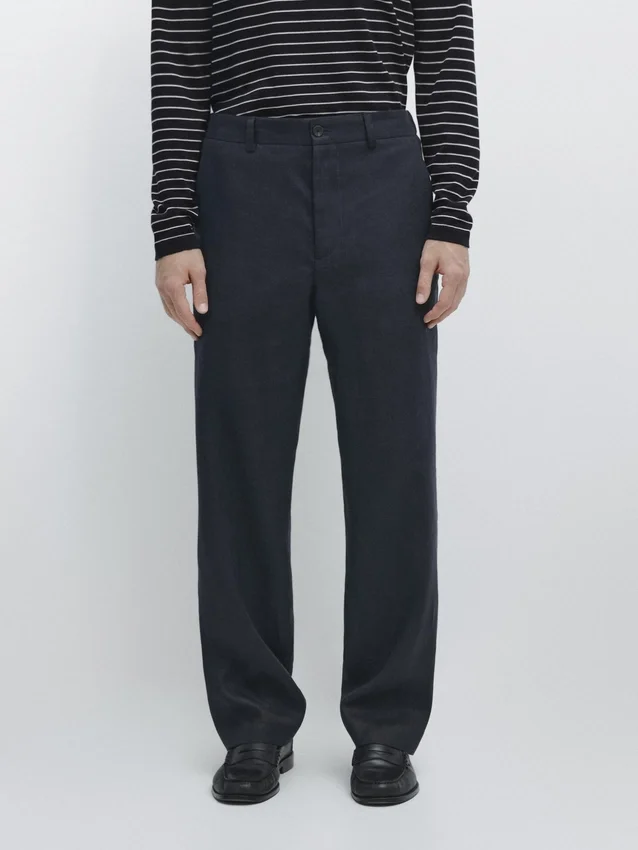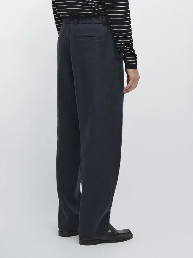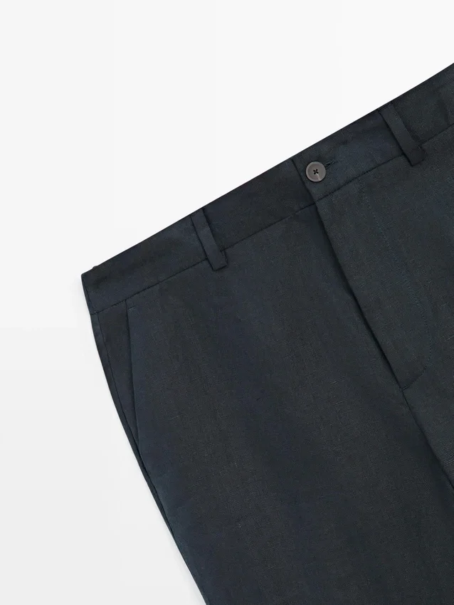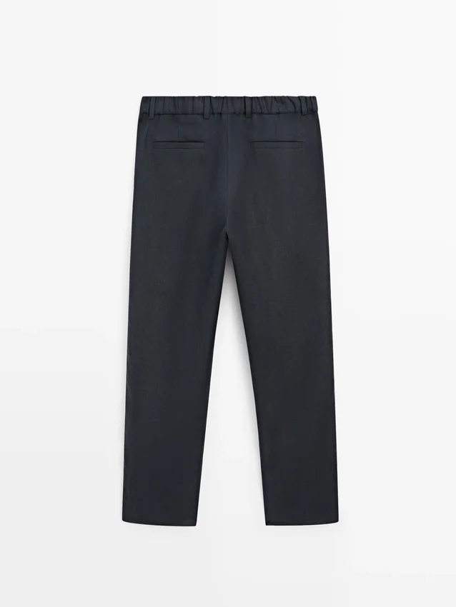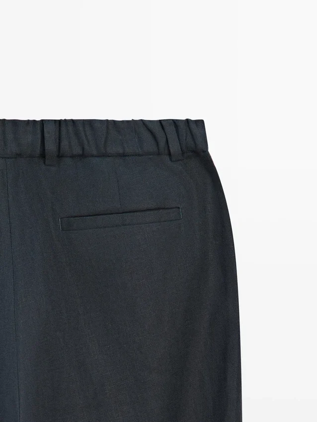 Hosen aus Leinen. Gürtelschlaufen. Reißverschluss vorne und Knopfverschluss oben. Elastischer Bund. Zwei Seitentaschen. Zwei Paspeltaschen hinten. Passendes Kleidungsstück erhältlich.
