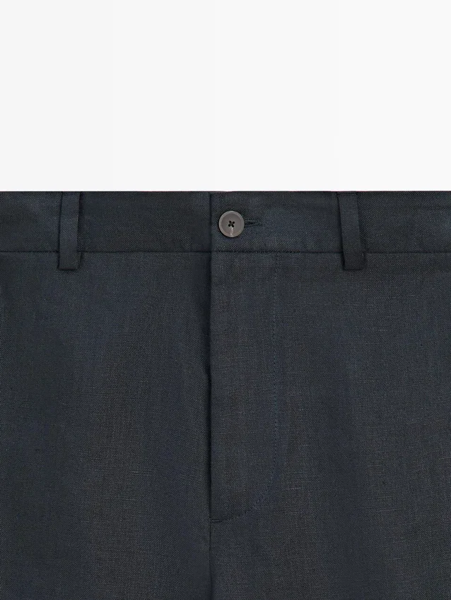 Hosen aus Leinen. Gürtelschlaufen. Reißverschluss vorne und Knopfverschluss oben. Elastischer Bund. Zwei Seitentaschen. Zwei Paspeltaschen hinten. Passendes Kleidungsstück erhältlich.Materialzusammensetzung
