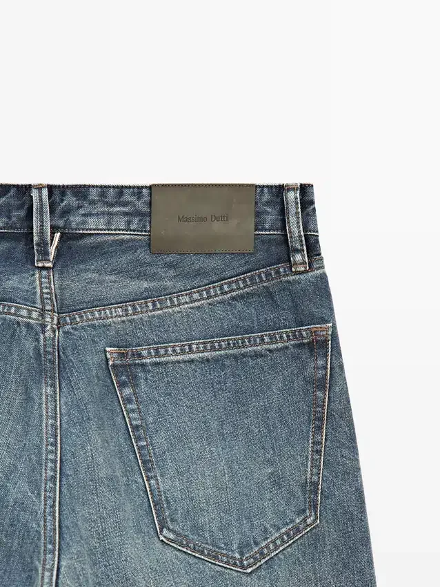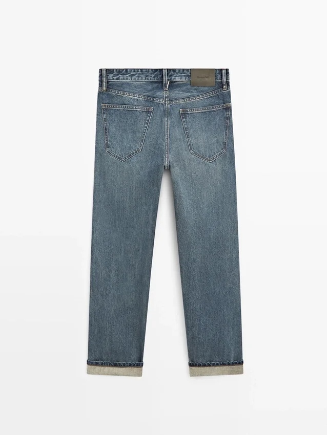 Selvedge-Jeans mit kontrastfarbener Webkante und gerader Außensaum. Fünf-Taschen-Design.