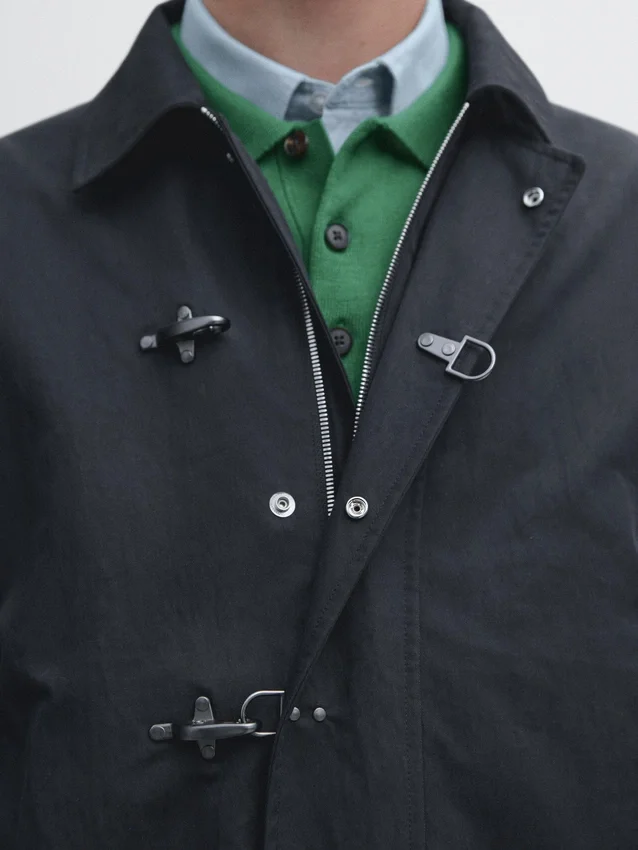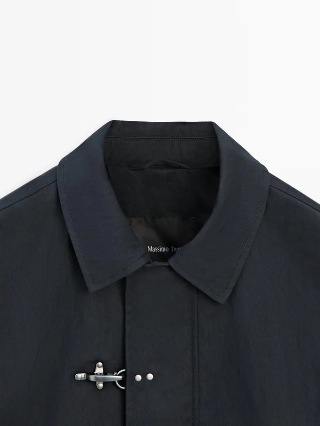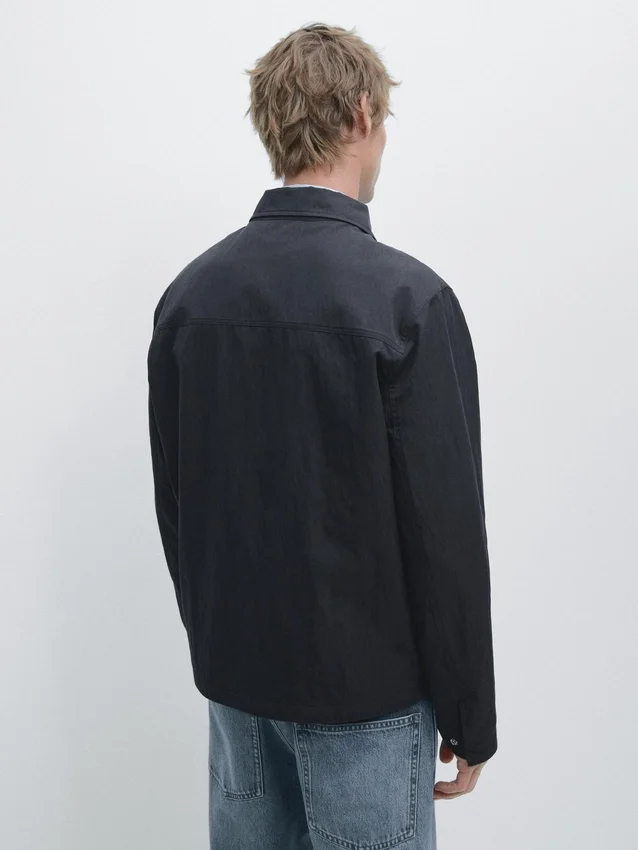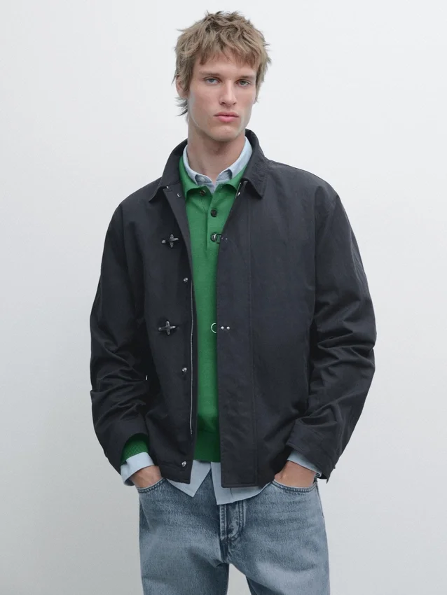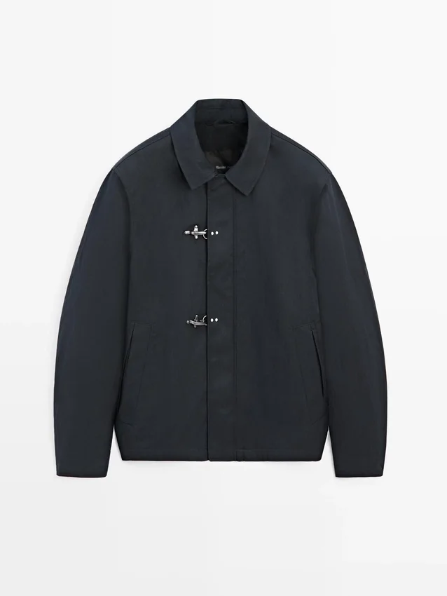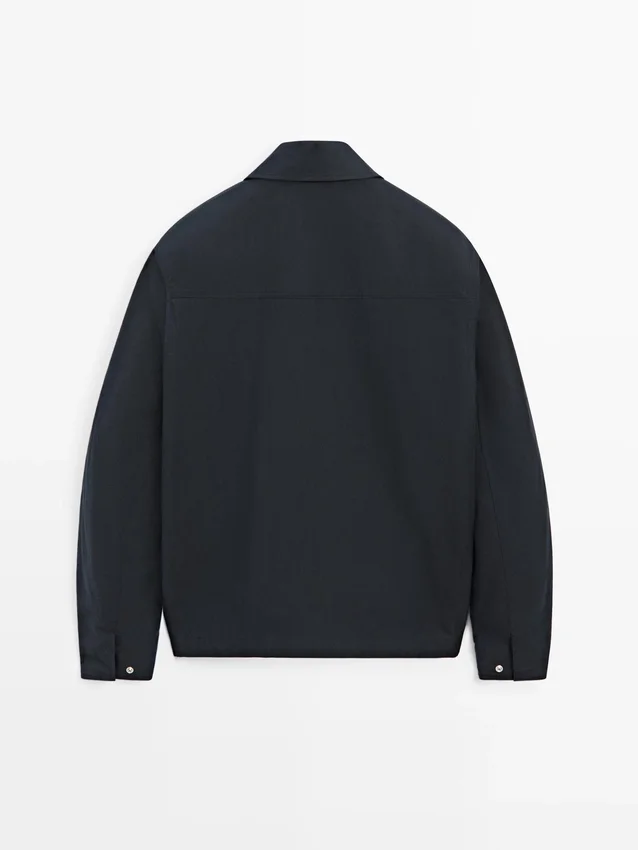 Jacke aus Baumwollmischgewebe. Hemdkragen. Lange Ärmel. Knopfverschluss mit Knebelknöpfen.