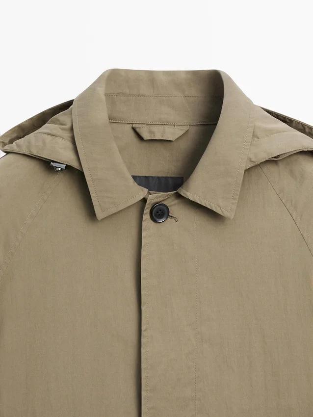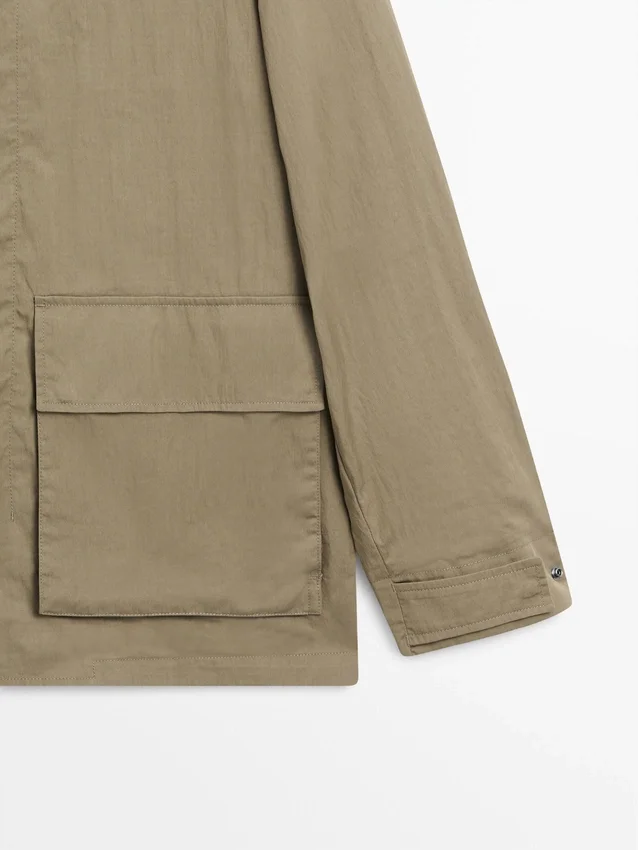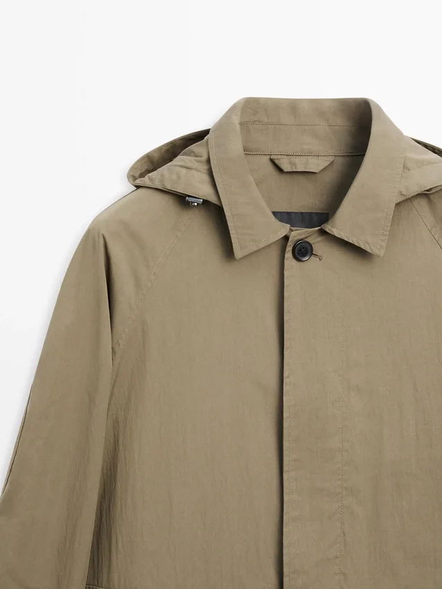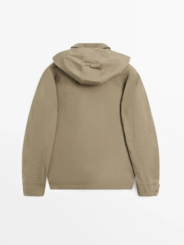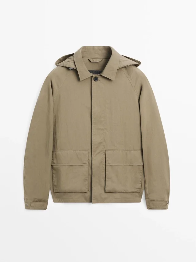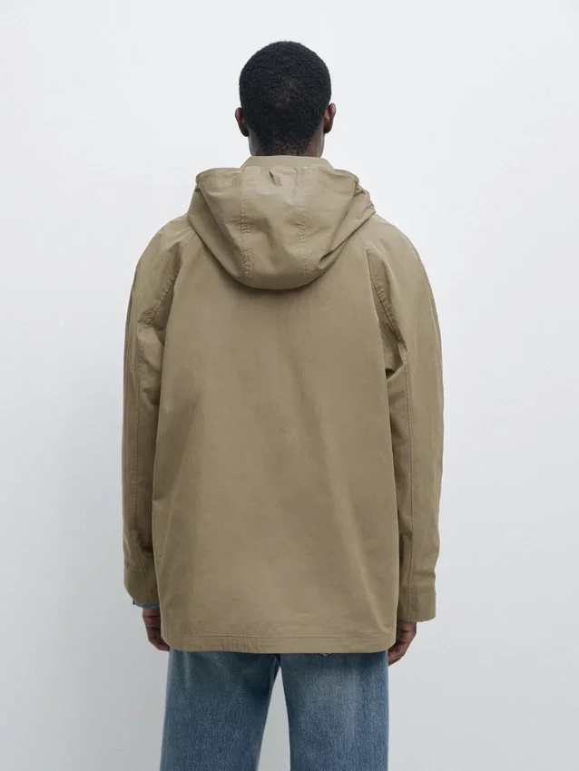 Parka aus Baumwollmischgewebe. Lange Ärmel mit geknöpften Manschetten. Hemdkragen. Abnehmbare Kapuze. Knopfleiste vorne. Zwei aufgesetzte Taschen mit Patten.