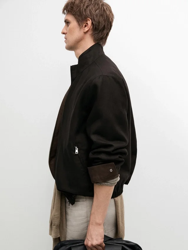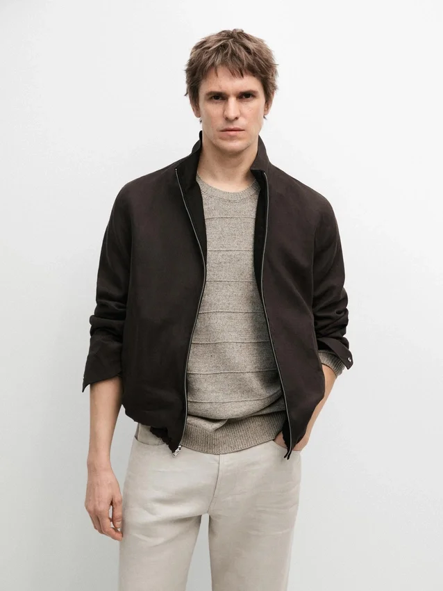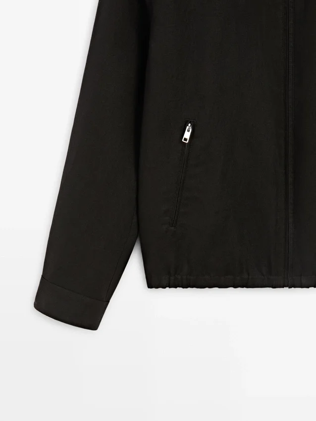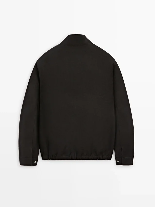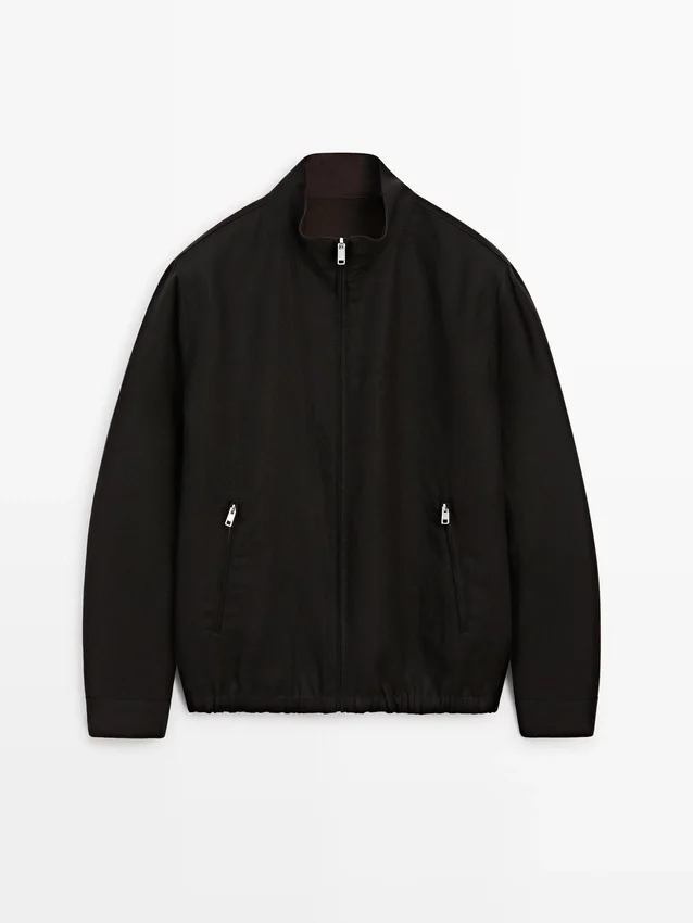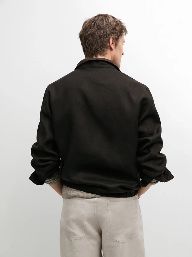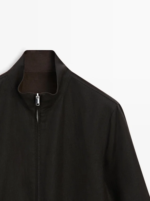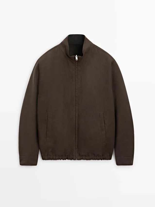 Jacke aus 100 % Leinenstoff. Stehkragen. Lange Ärmel. Reißverschluss. Zwei Reißverschlusstaschen. Elastisches Band am Saum. Wendbares Kleidungsstück.