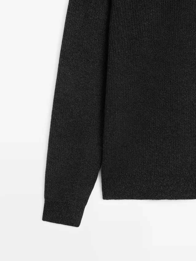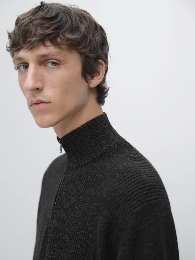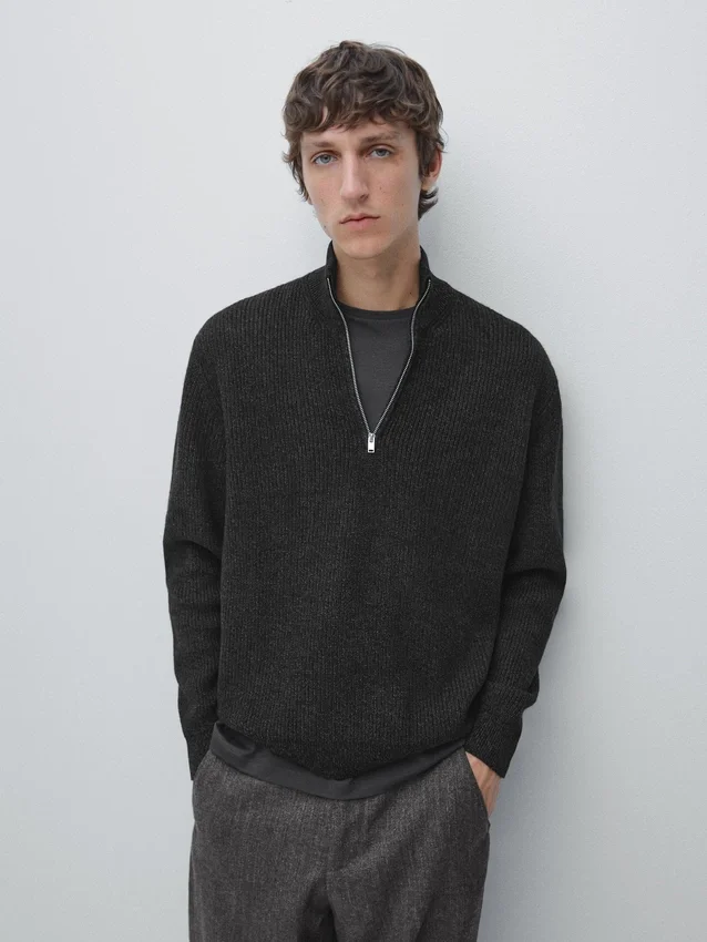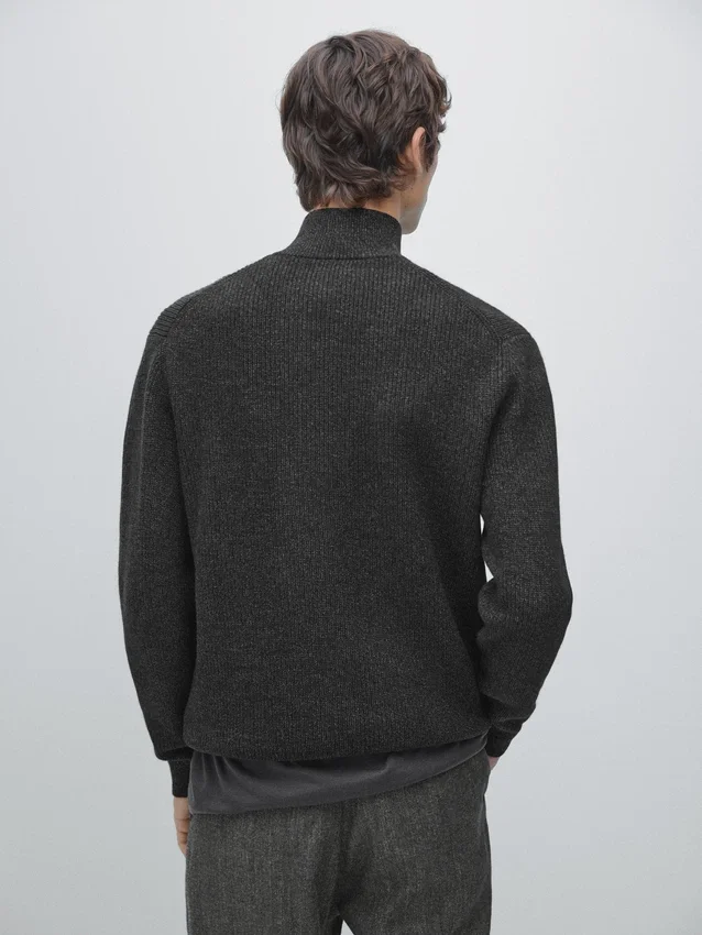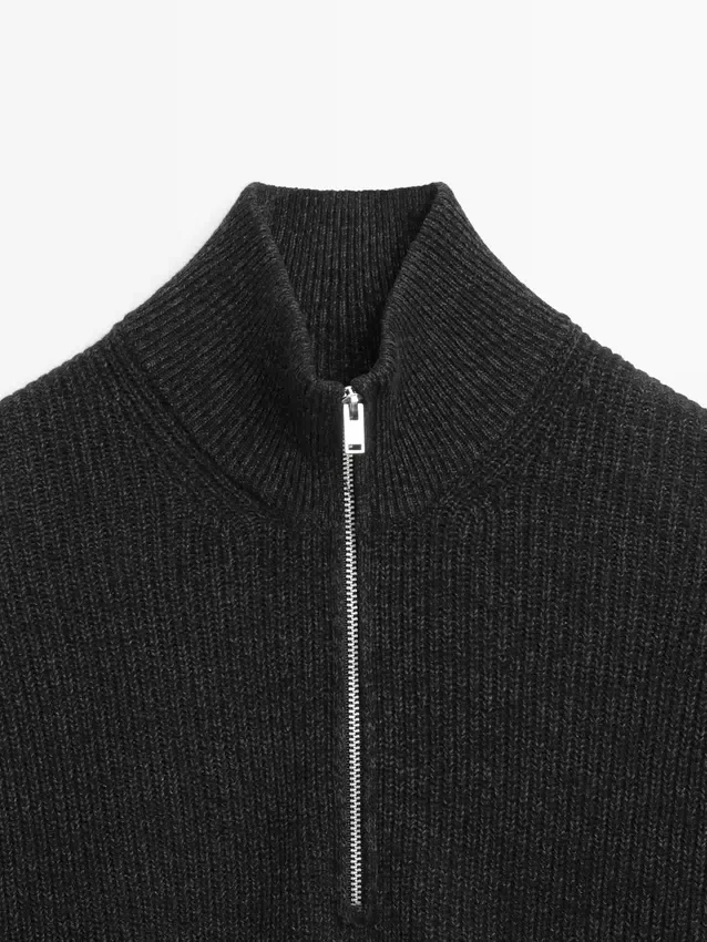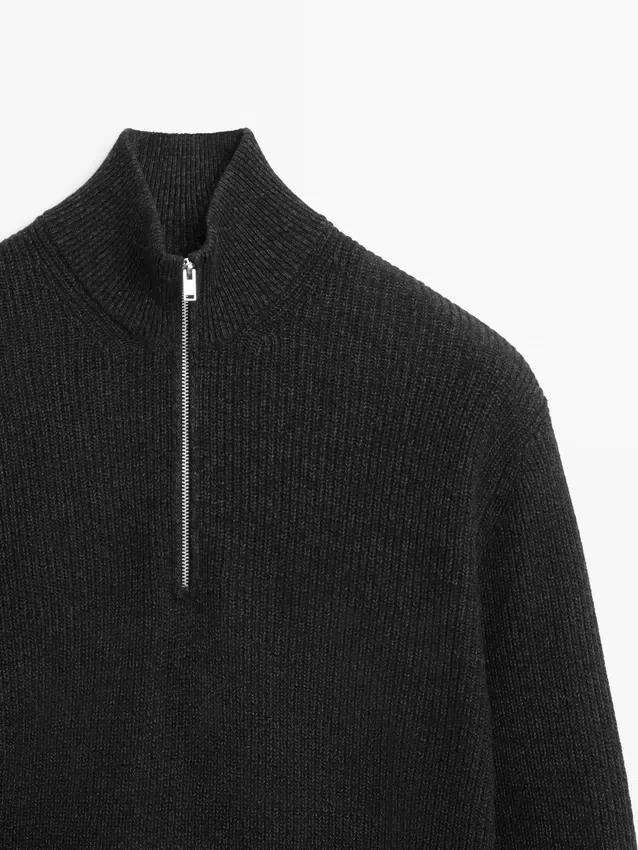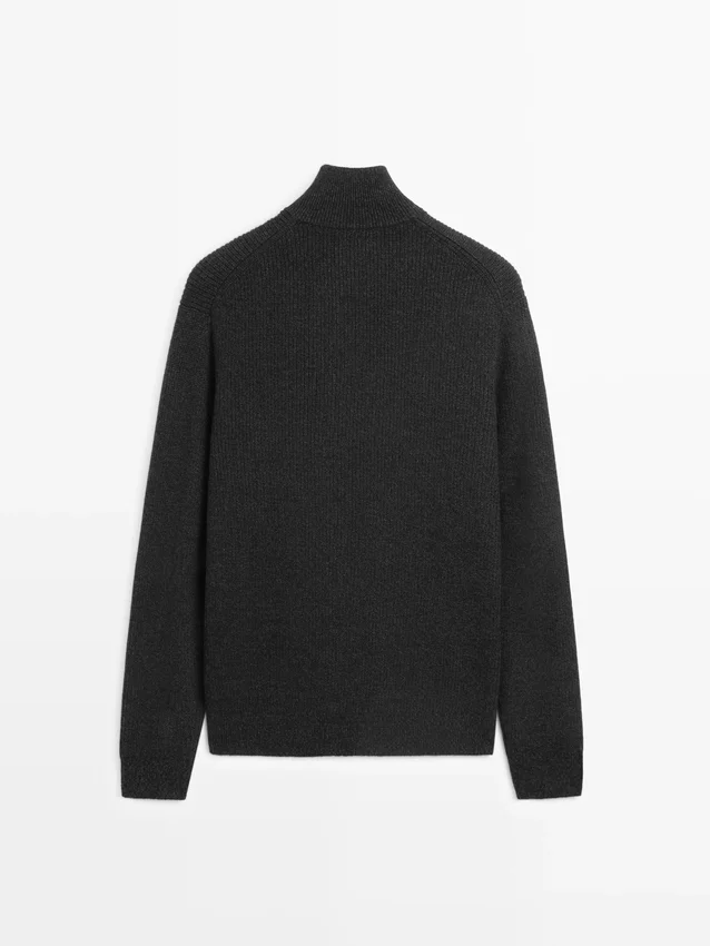 Pullover aus Strickstoff mit Baumwolle und Wolle. Lange Ärmel. Stehkragen mit Reißverschluss. Gerippte Bündchen.